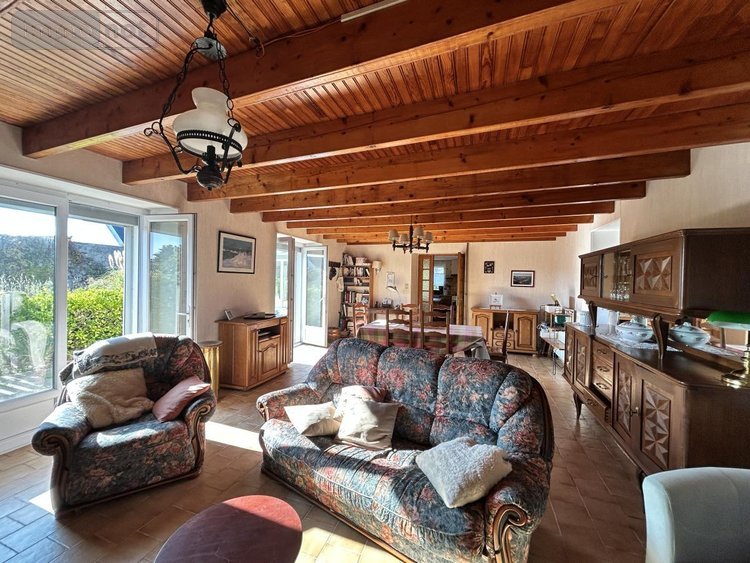 BELLE ILE EN MER - Située dans un village, proche à pied des sentiers côtiers et de Port Pouldon, maison ancienne à rénover comprenant au rez-de-chaussée : véranda à usage d'entrée, cuisine équipée, salle d'eau et W.C., salon/séjour avec cheminée. A l'étage : trois chambres, salle de bains. Chaufferie. Garage d'environ 29m², puits et jardin. LOCMARIA