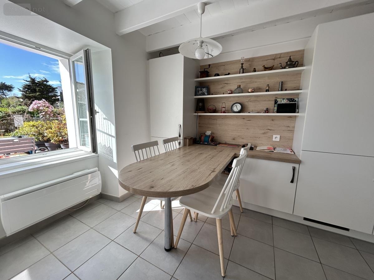 BELLE ILE EN MER - Située à quelques minutes à pied des sentiers côtiers et de la plage de Pouldon, maison mitoyenne de part et d'autre, d'environ 63 m² habitables comprenant au rez-de-chaussée: séjour avec poêle à bois et cuisine ouverte , au 1er étage: palier desservant chambre et salle d'eau avec W.C, au 2ème étage sous comble: chambre. Dépendance en pierres d'environ 40m² comprenant: salon, salle d'eau avec W.C. cuisine en appentis, et une chambre à l'étage. Garage en pierres. Jardin et terrasse. Assinissement et compteurs communs à la maison et la dépendance. LOCMARIA