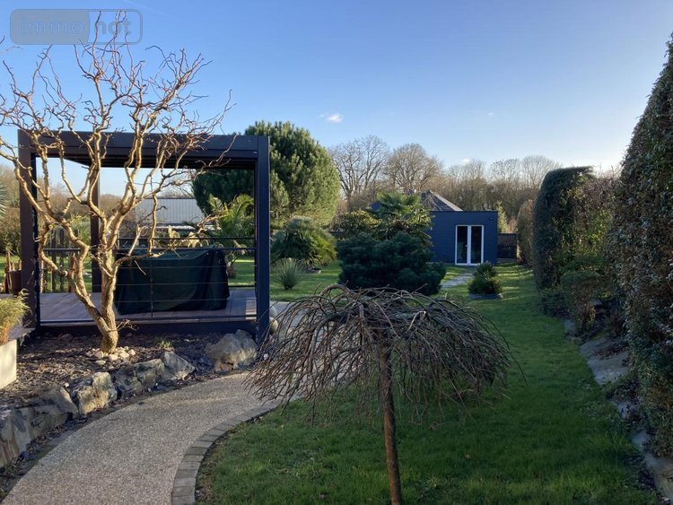 Le jardin arboré dispose d'une vaste terrasse exposée Sud-Ouest, équipée d'une pergola, et d'un store banne électrique. L'entretien est facilité par une cour enrobée, un robot de tonte, et un puits pour l'arrosage