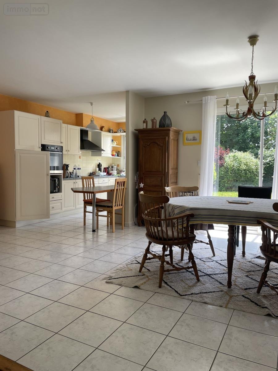 un hall avec placard, wc, cuisine aménagée et équipée ouverte sur la salle à manger (accès direct terrasse et jardin), salon avec cheminée insert