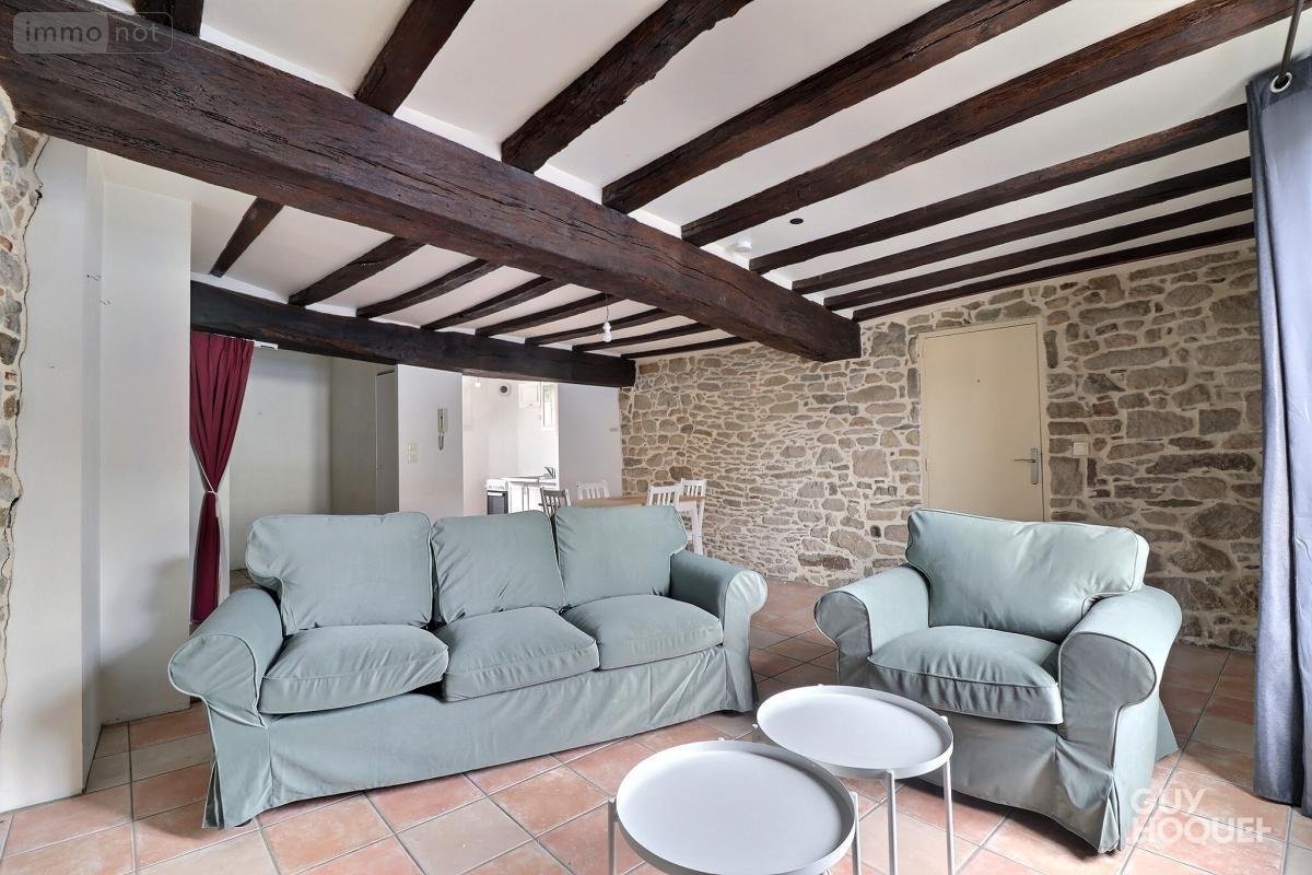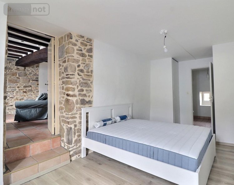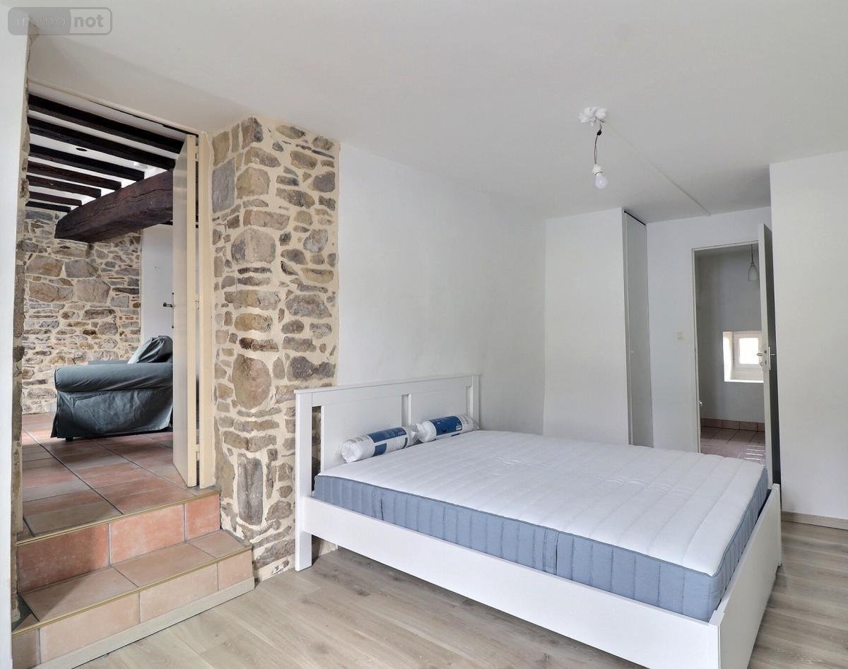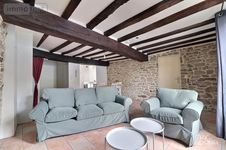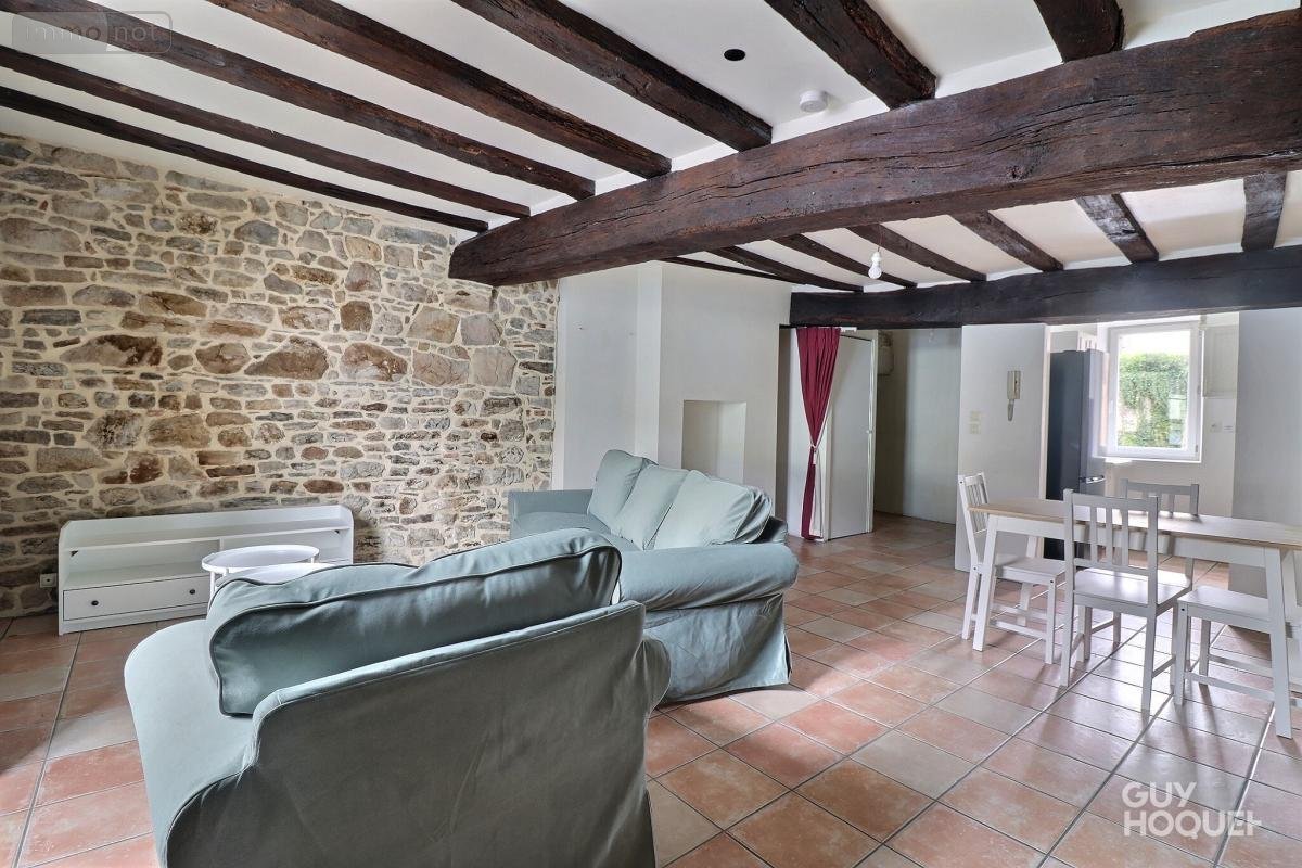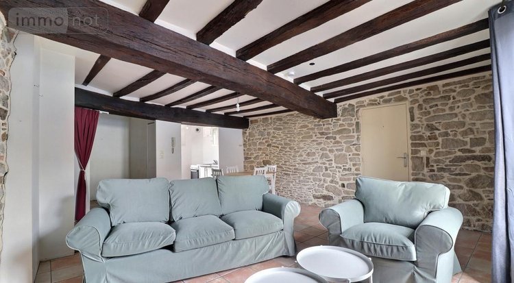 Entrée, placards, cuisine aménagée semi-ouverte sur un séjour-salon avec poutres et murs en pierre