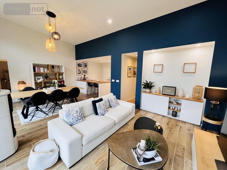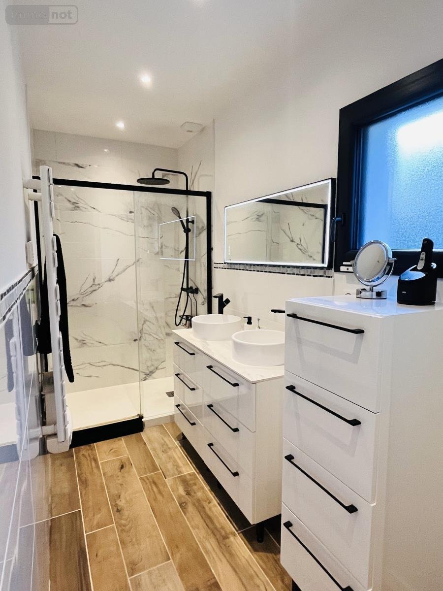 d'une entrée, un séjour salon avec poêle donnant sur une belle terrasse en bois, cuisine ouverte équipée et aménagée, espace nuit séparé, suite parentale accès terrasse, avec dressing et salle d'eau privative, deux chambres, salle de bains, sanitaires avec lave-mains.