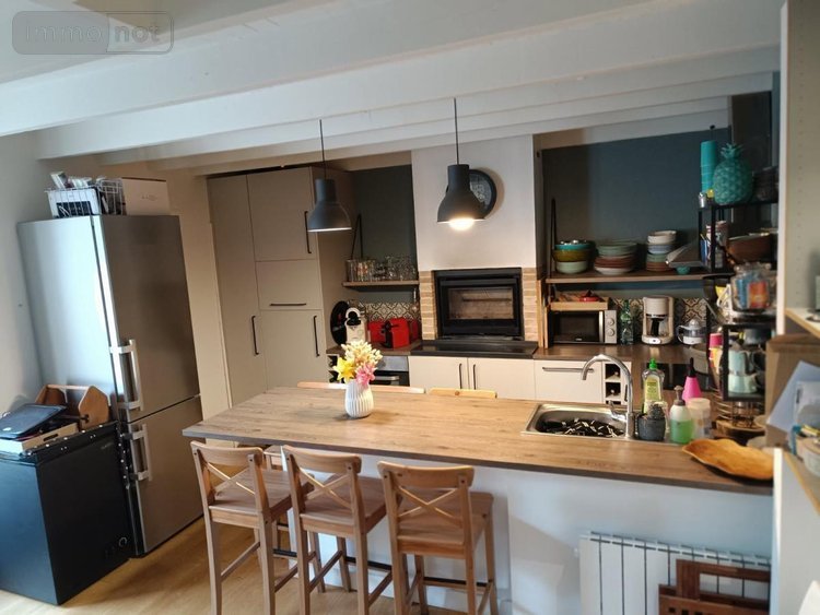 Au rez-de-chaussée : salon, cuisine équipée et aménagée avec un poêle, salle d'eau.
