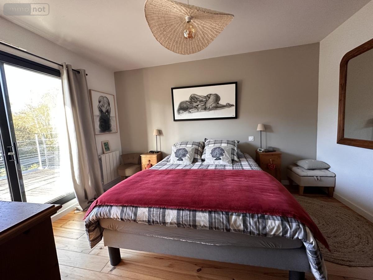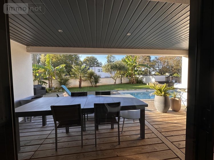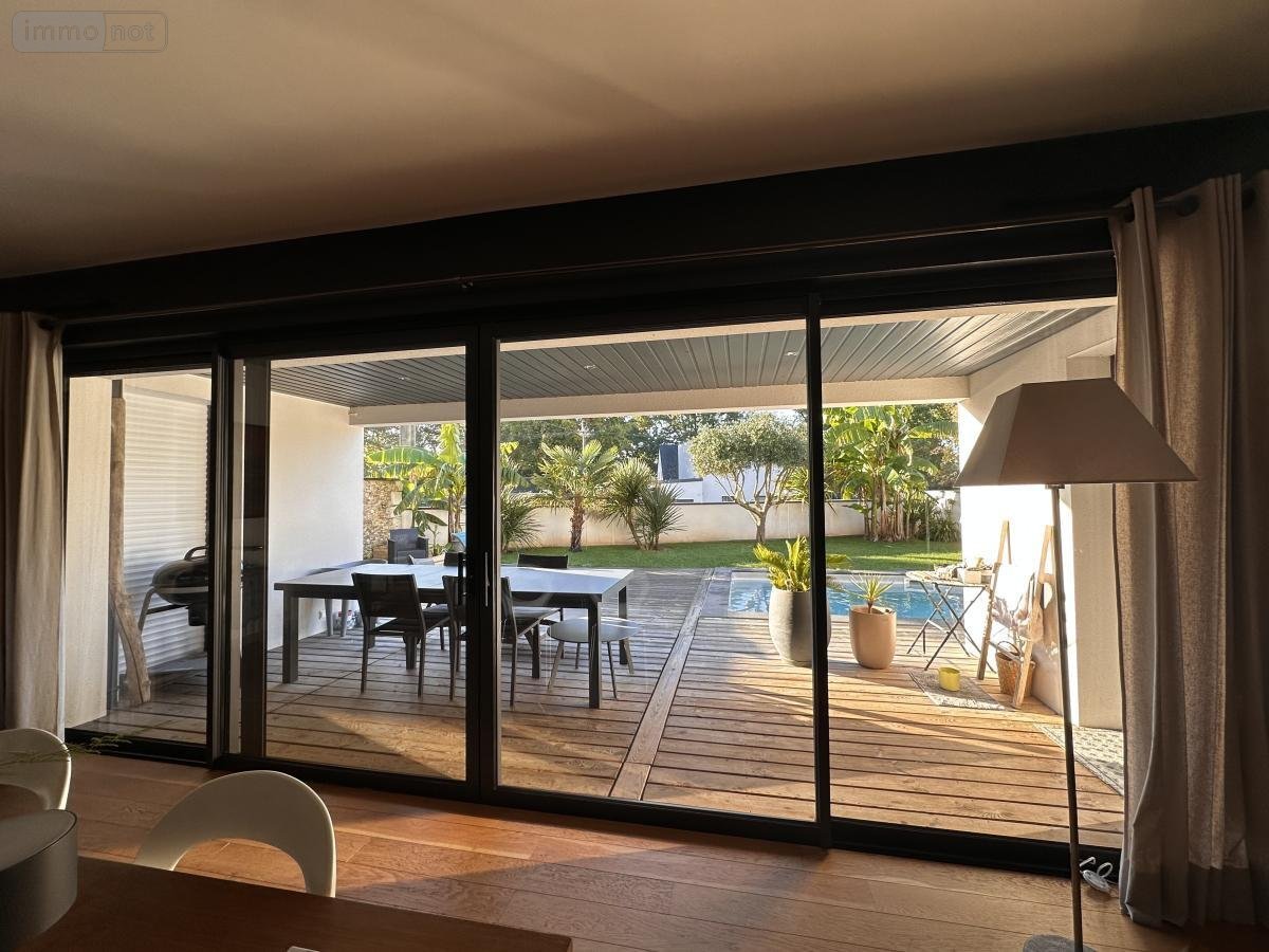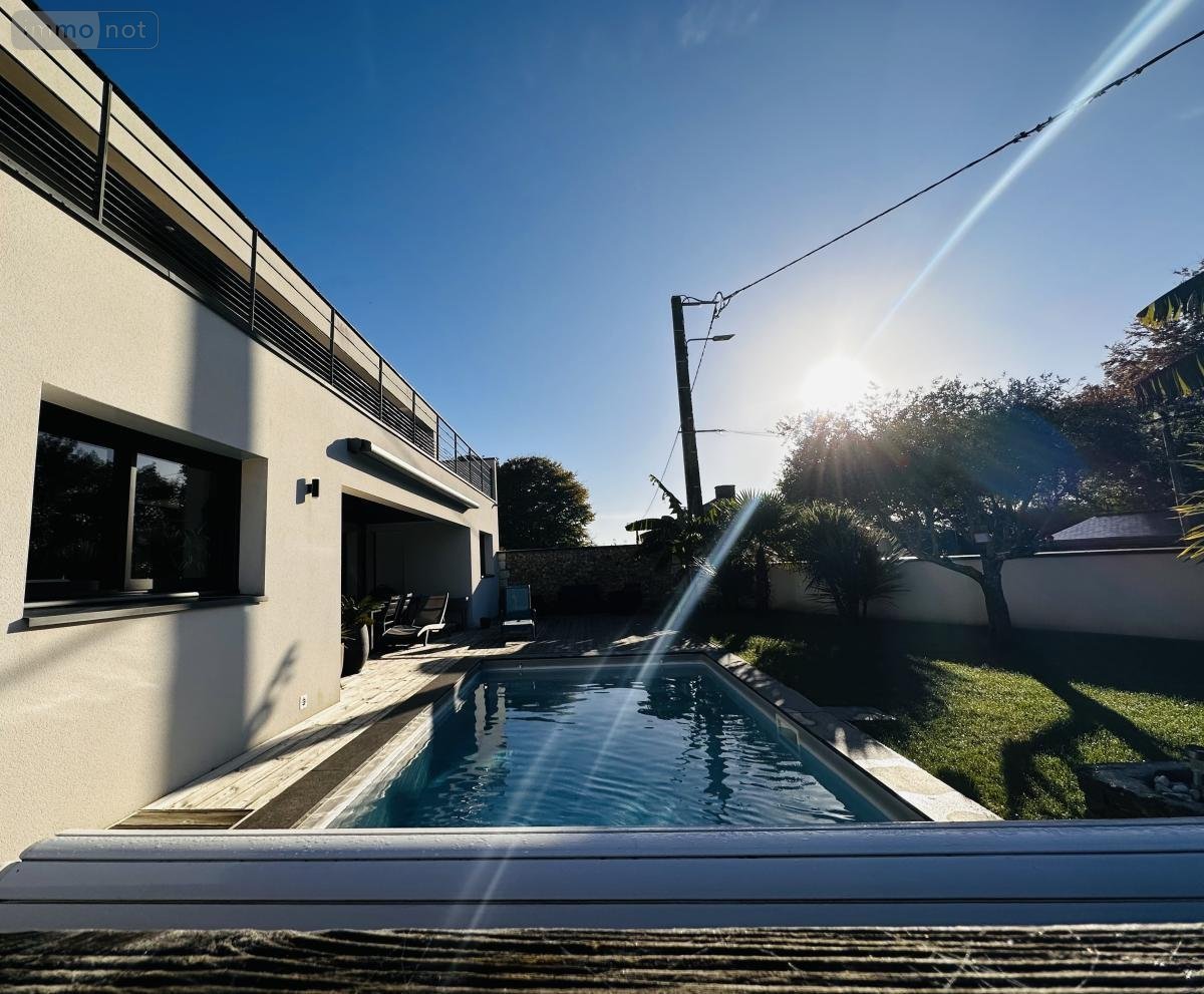 A VENDRE (56) ST AVE PROCHE VANNES CLINIQUE et GARE : JOLIE MAISON D'ARCHITECTE DE 2017, SUR TERRAIN CLOS DE 405 m² AVEC PISCINE CHAUFFEE: RDC : Entrée sur très belle pièce de vie (séjour-salon, coin bibliothèque) avec poêle à granulés, le tout donnant sur une terrasse en bois, couverte + store banne, jardin clos de murs , cuisine am-équipée donnant sur terrasse, wc/lave-mains, bureau, salon télévision, dressing, 1 belle chambre/salle d'eau privative et sortie terrasse - ETAGE : mezzanine à usage de salle de jeux avec grande baie donnant sur terrasse, 1 ch/parquet/dressing/salle d'eau/wc (accès terrasse), 1 ch/parquet/placard (accès terrasse), 1 ch/parquet/placard, wc, salle d'eau GARAGE AVEC COIN ATELIER ET CAVE A VIN ETANCHE EN SOUS-SOL
