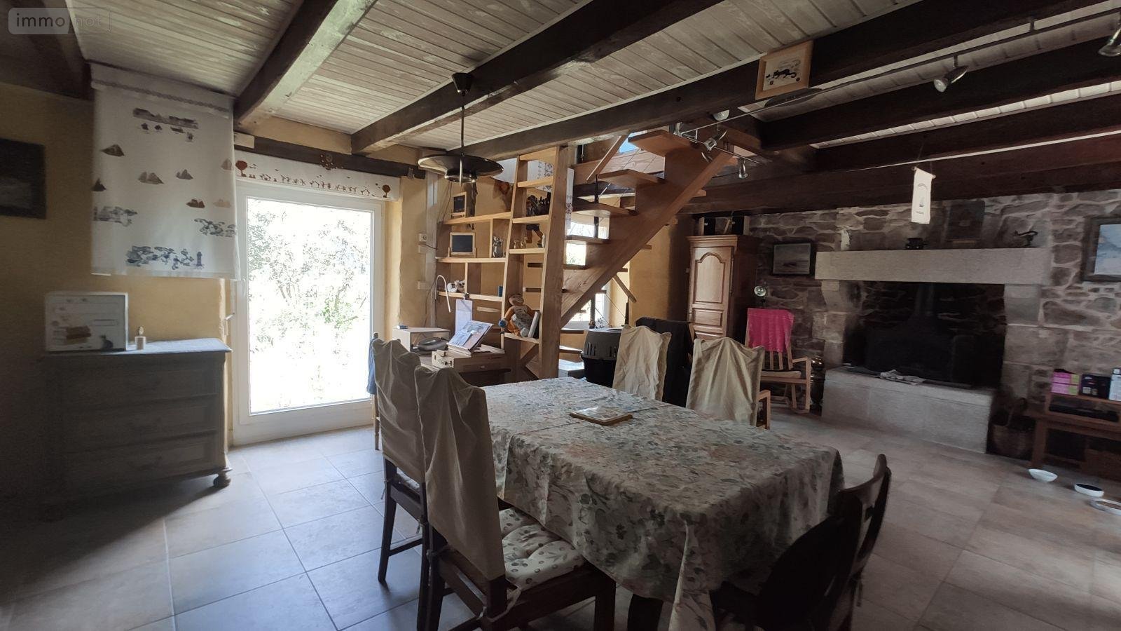 - au rez-de-chaussée : entrée couverte, belle salle à manger-salon avec cheminée (à foyer ouvert) et poêle à granulés, cellier, cuisine aménagée et en partie équipée (plaque de cuisson : 3 foyers gaz et 1 plaque électrique, hotte aspirante) salle d'eau douche et wc, une chambre.
