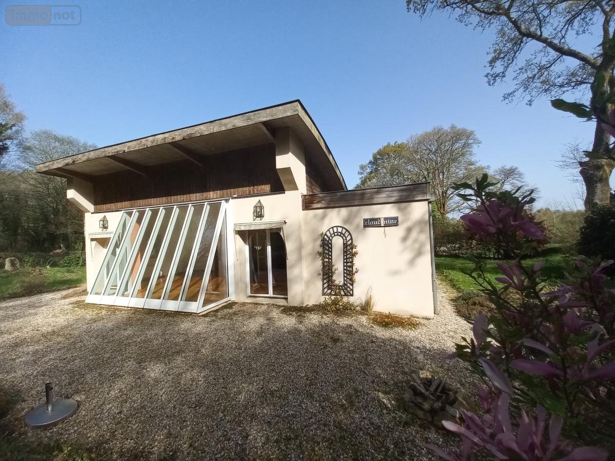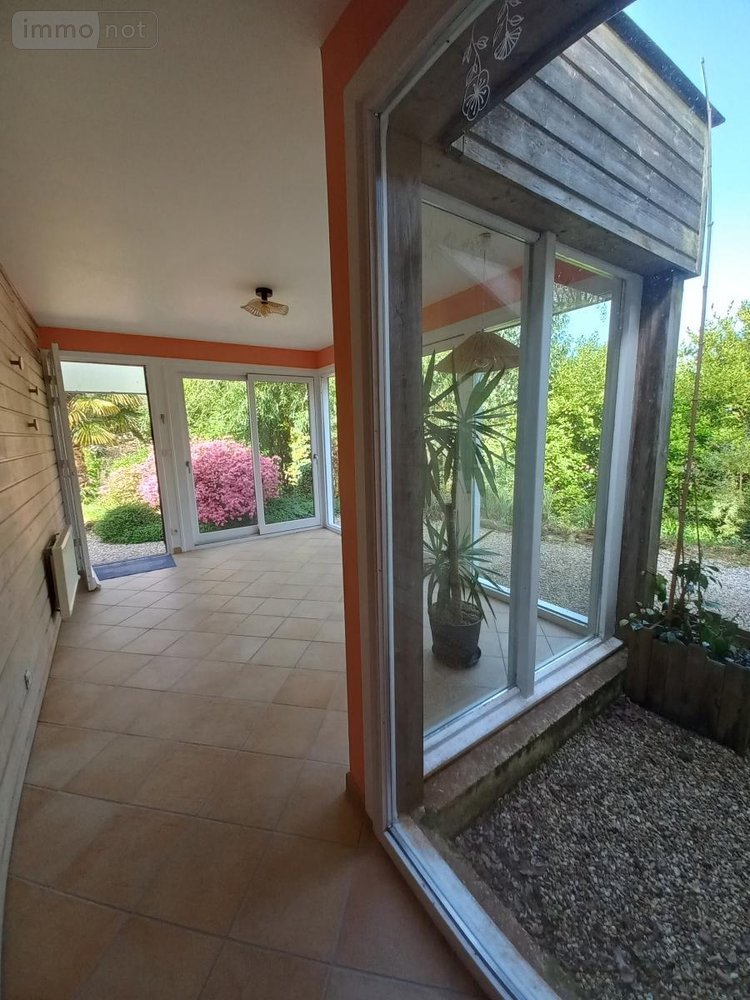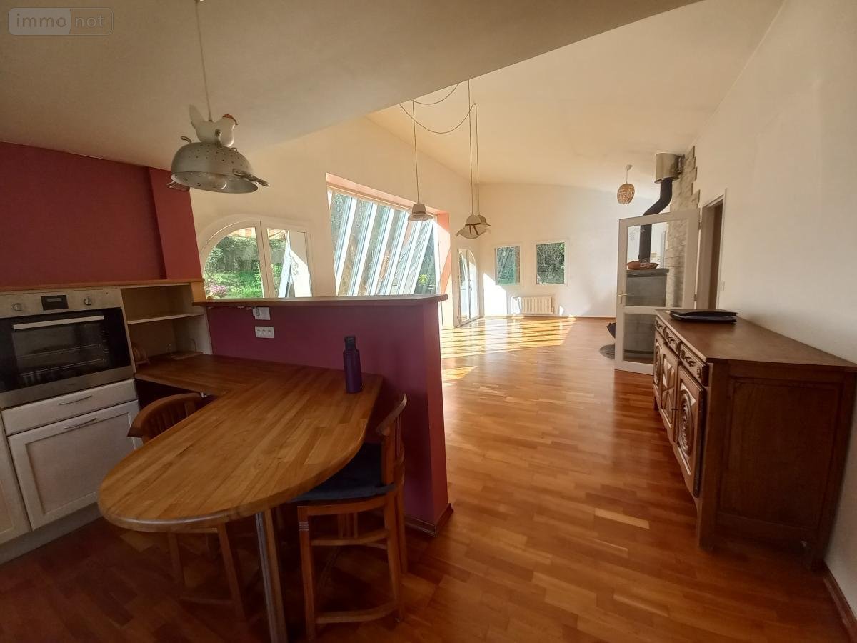 Charmante maison de plain-pied, dans un cadre verdoyant, comprenant : une entrée, un dégagement avec placard, une cuisine ouverte sur salon-séjour lumineux grâce à sa magnifique verrière, agrémenté d'un poêle à bois, trois chambres, une salle de bains avec baignoire et douche, un wc avec lave-mains. Atelier sur l'arrière. Jardin privatif et parcelle boisée.