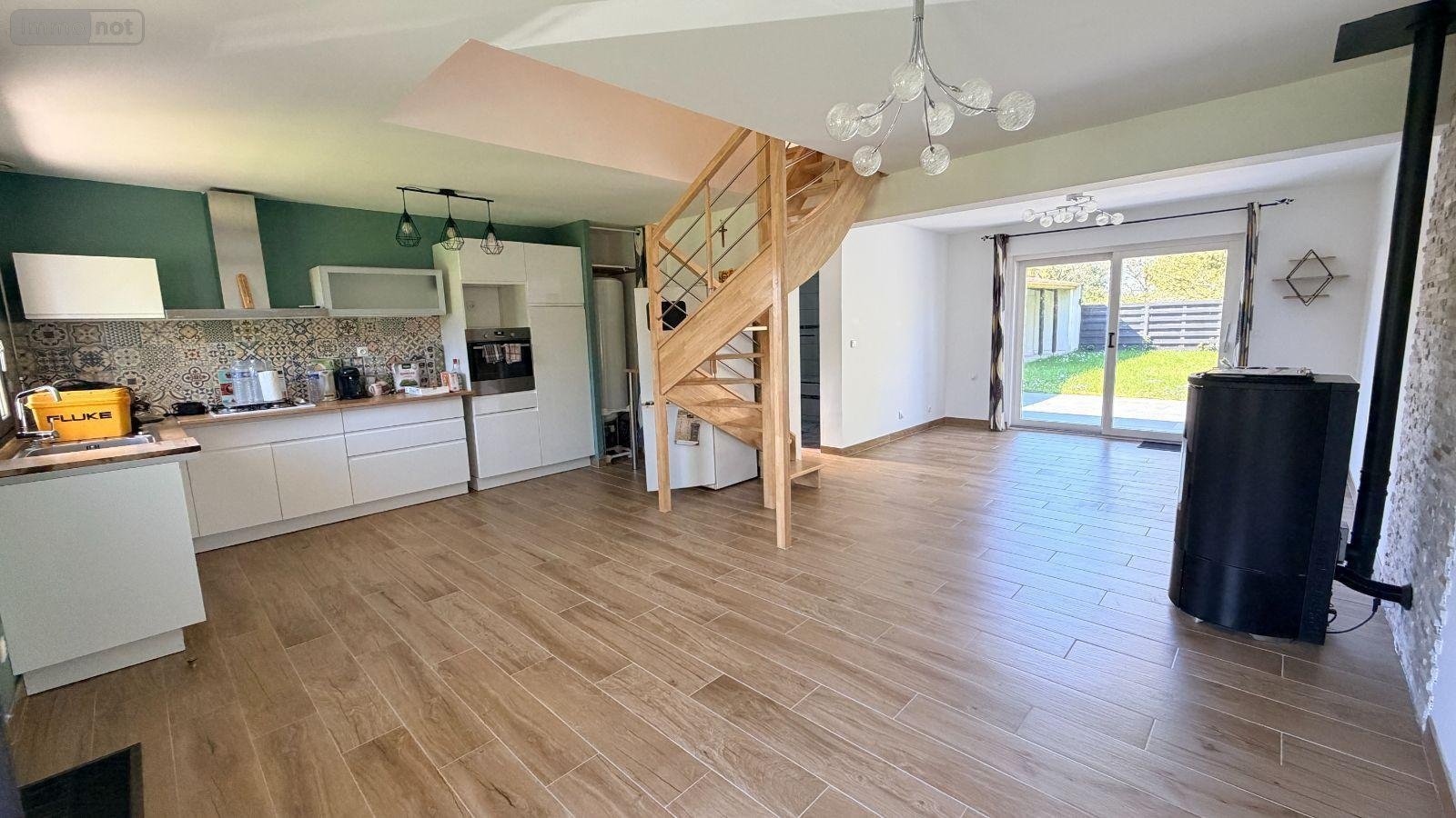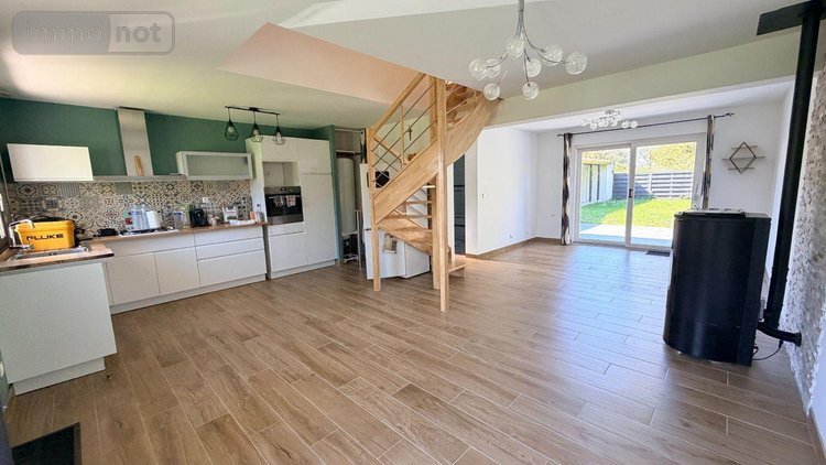 Maison individuelle de 74 m2, avec au RDC : le salon / salle à manger, une cuisine ouverte Aménagée et Equipée, WC, Salle de bains.