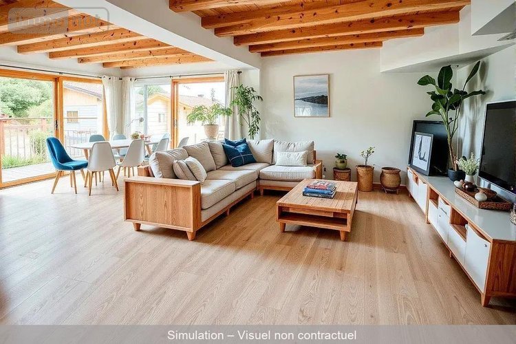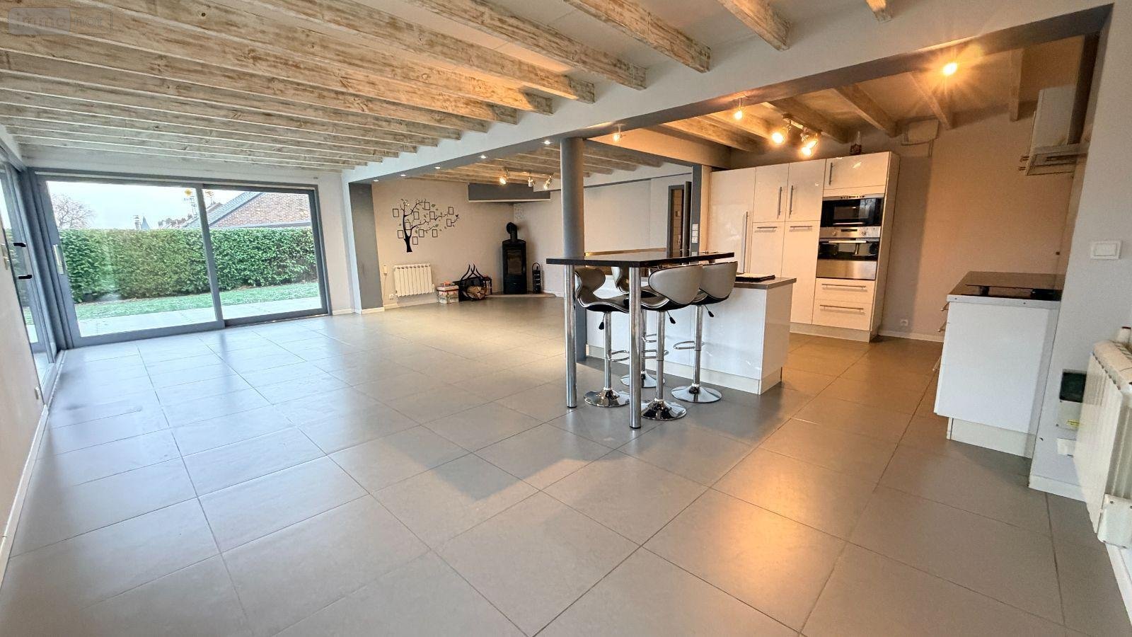 Grande pièce de vie lumineuse avec poêle à bois