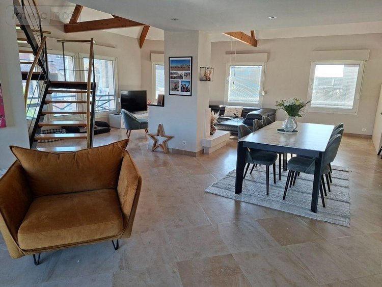 au 1er étage: hall d'entrée, grand séjour (64,49m2) avec poêle à granulés et coin cuisine équipée (10,09m2), 1 chambre (13.05m2) et un bureau (8.69m2),WC, salle de bains avec douche italienne , meuble vasque, sèche serviette, cellier.