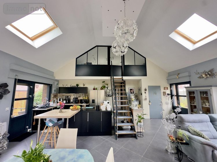 Grand espace de vie de 50m² ouvert sur la cuisine équipée bénéficiant d'une belle luminosité, wc, couloir, 3 chambres, salle de bains,