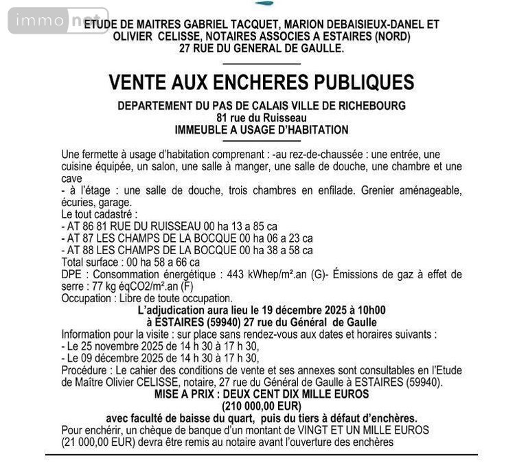 L'adjudication aura lieu le 19 DECEMBRE 2025 à 10H en l'étude d'Estaires, 27 rue du Général de Gaulle.