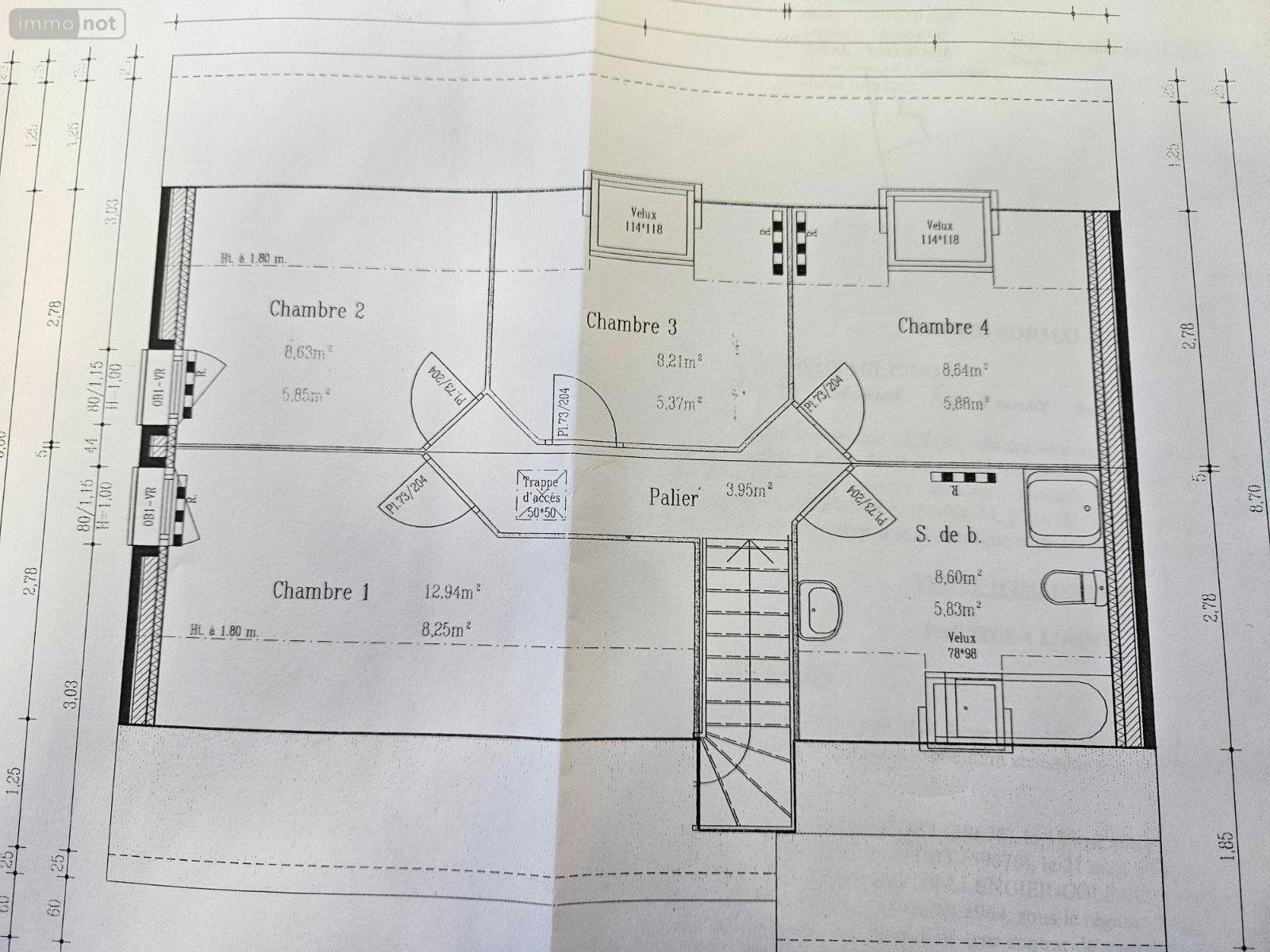 PREMIER ETAGE : palier, quatre pièces pouvant servir de chambre (surfaces : voir plan en photos), salle de bains (avec lavabo, douche et baignoire).