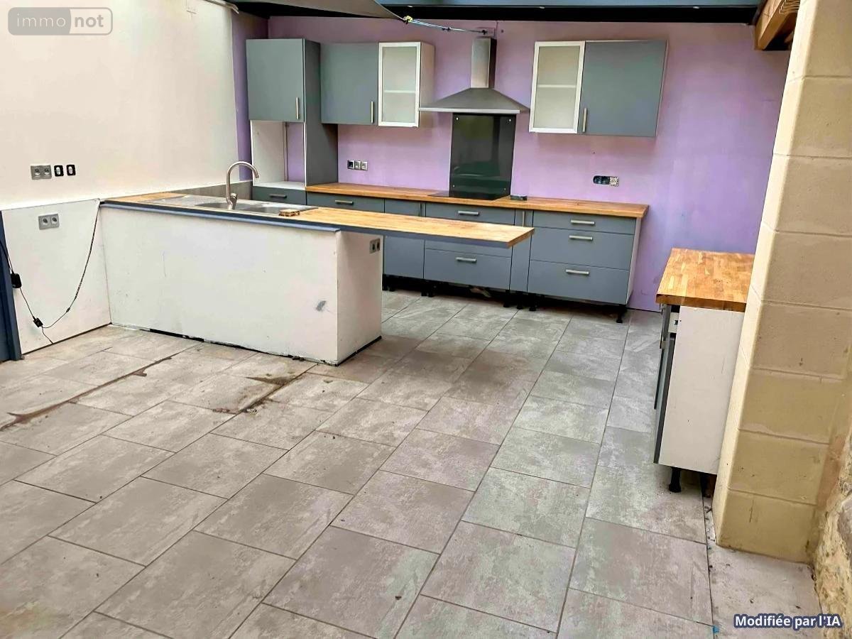FALAISE Maison de ville construite en pierres, couverte en tuiles et ardoises, comprenant au rez-de-chaussée, séjour, salon, wc, cuisine aménagée, débarras, à l'étage palier deux chambres, salle d'eau avec wc, grenier sur l'ensemble, double vitrage, chauffage électrique
