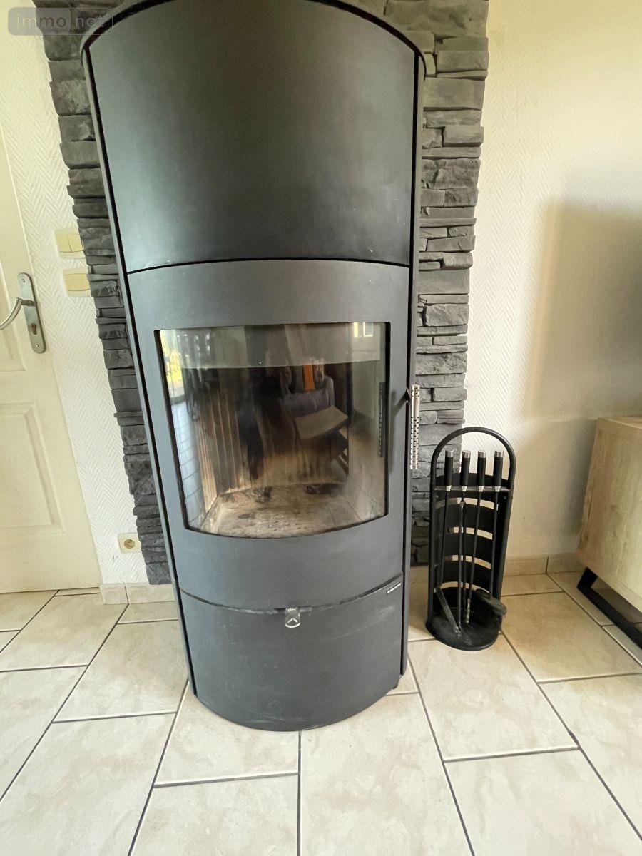 Construction contemporaine offrant 4 chambres et un bureau, double vitrage PVC, chauffage électrique et poêle à bois, 3 garages, vue agréable sur la campagne.