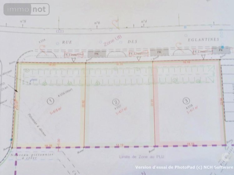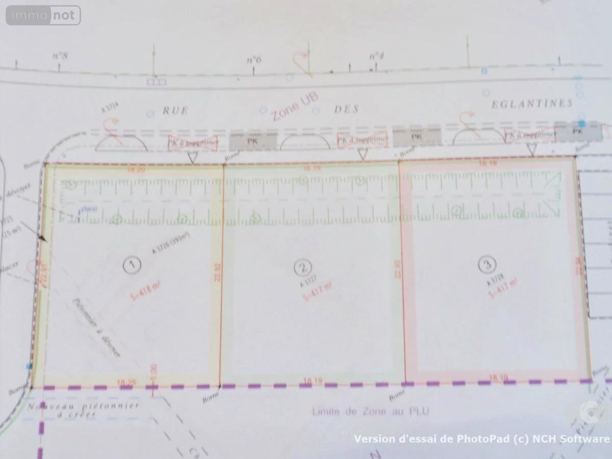 3 terrains constructibles de 417 m² avec une façade de 18m19 exposés Sud-Ouest.