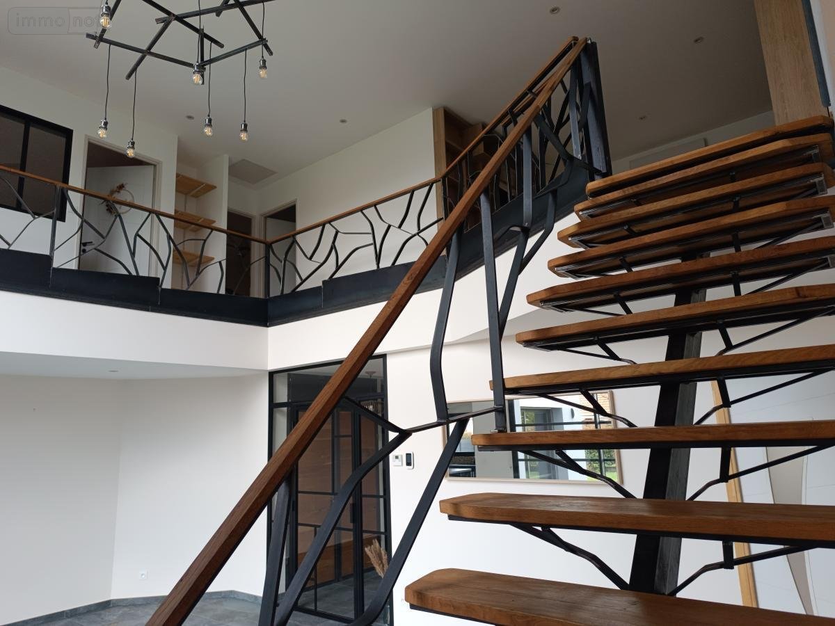 À l'étage, un escalier design conçu par un artiste, apportant une touche artistique et exclusive a la maison, mène à une grande mezzanine actuellement aménagée en bureau, pouvant facilement être transformée en chambre supplémentaire.