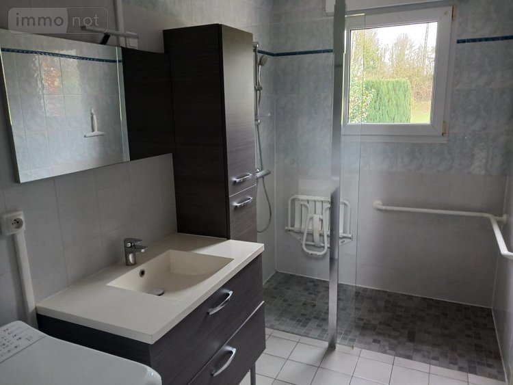 A louer maison de 123 m² comprenant au rez- de- chaussée: hall d'entrée, séjour- salon, cuisine équipée séparée, 1 chambre, salle de bains avec douche, WC séparés, à l'étage: 1 palier et 3 chambres.