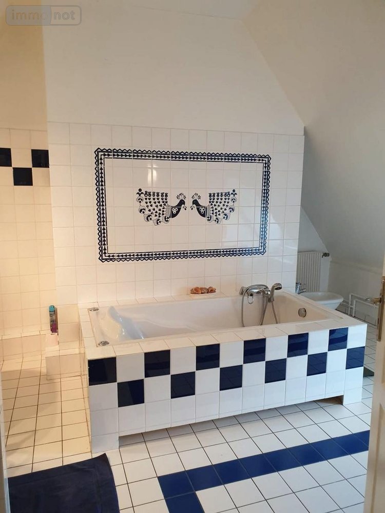 Au premier étage : deux grandes chambres, bureau, salle de bains avec baignoire balnéo, salle d'eau, dressing et lingerie.