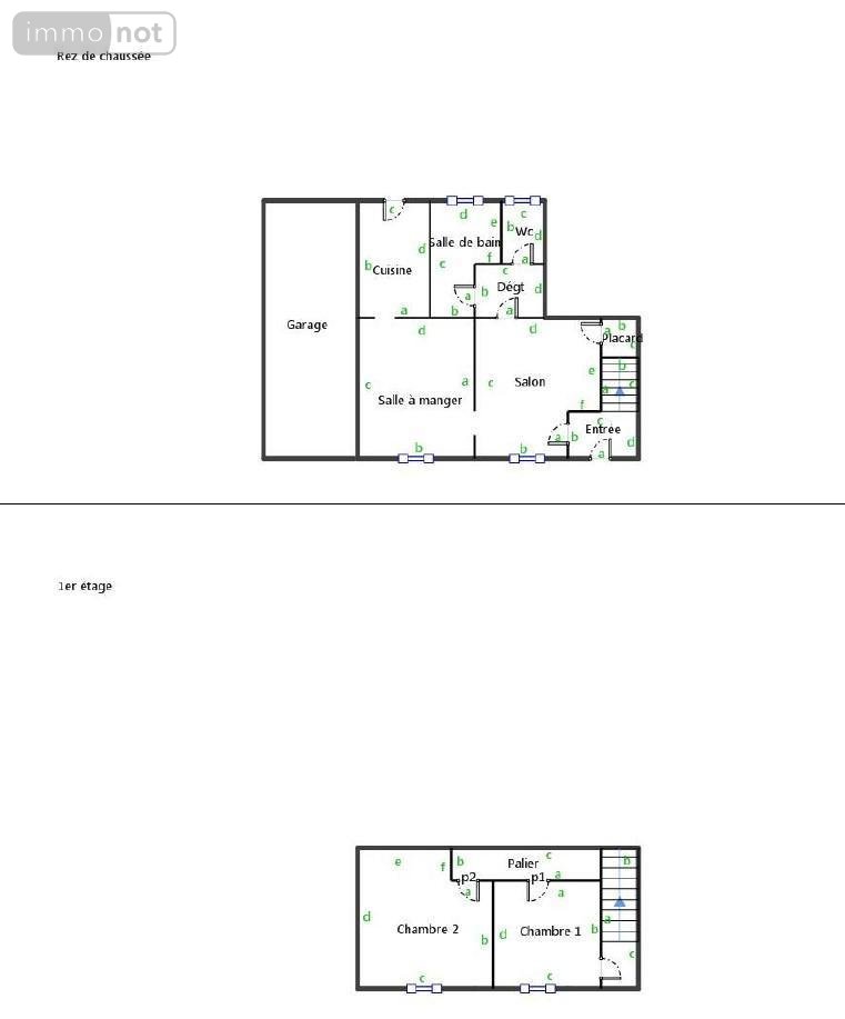 - rez-de-chaussée : entrée (2,28 m²) donnant sur salon (13,65 m²), salle à manger (13 m²), cuisine (4,62 m²), dégagement (2,06 m²) donnant sur salle de bain (6,27 m²) et WC (1,19 m²) ;