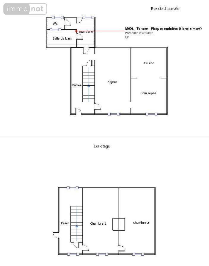 - rez-de-chaussée : entrée sur couloir (7,43 m²), séjour (20,59 m²), espace repas donnant sur cuisine (16,5 m²), dégagement (6,3 m²) donnant sur salle de bain (3,92 m²) et WC (1,31 m²) ;