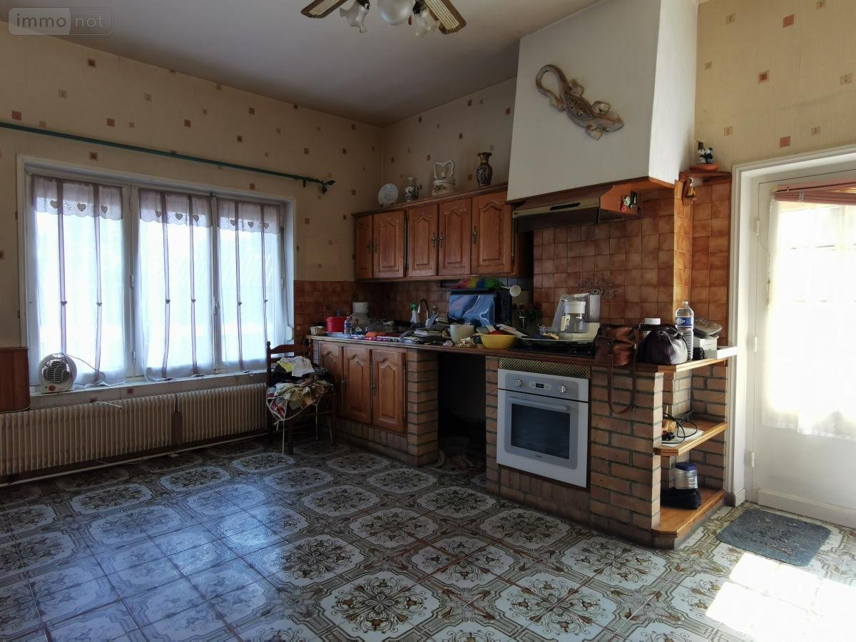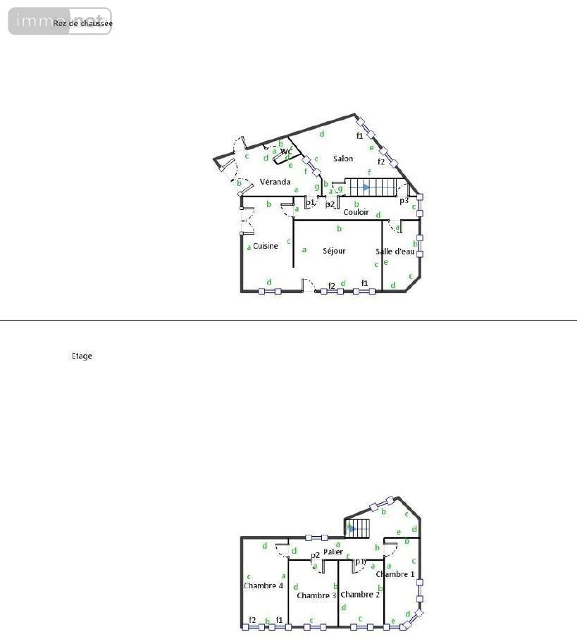 - rez-de-chaussée : entrée donnant sur salon-séjour (28,5 m², cheminée non tubée), grande cuisine (21 m², avec second accès extérieur), couloir desservant salle d'eau (6,5 m²) ainsi qu'une pièce (chambre, 20 m²) et un espace véranda non chauffée et WC ;