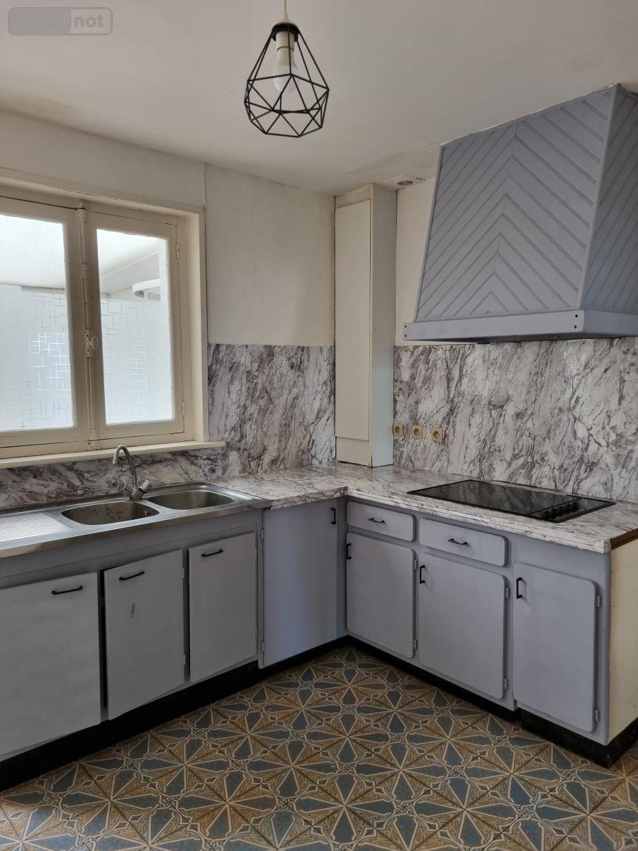 Maison de village, lumineuse, comprenant : salle de séjour, salon, cuisine meublée, plaque de cuisson, hotte, véranda, salle de douche, WC, cave, cour. A l'étage, palier, 2 chambres. Chauffage au gaz. Fosse septique.