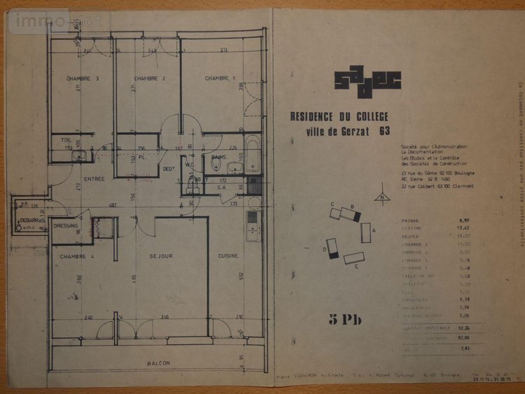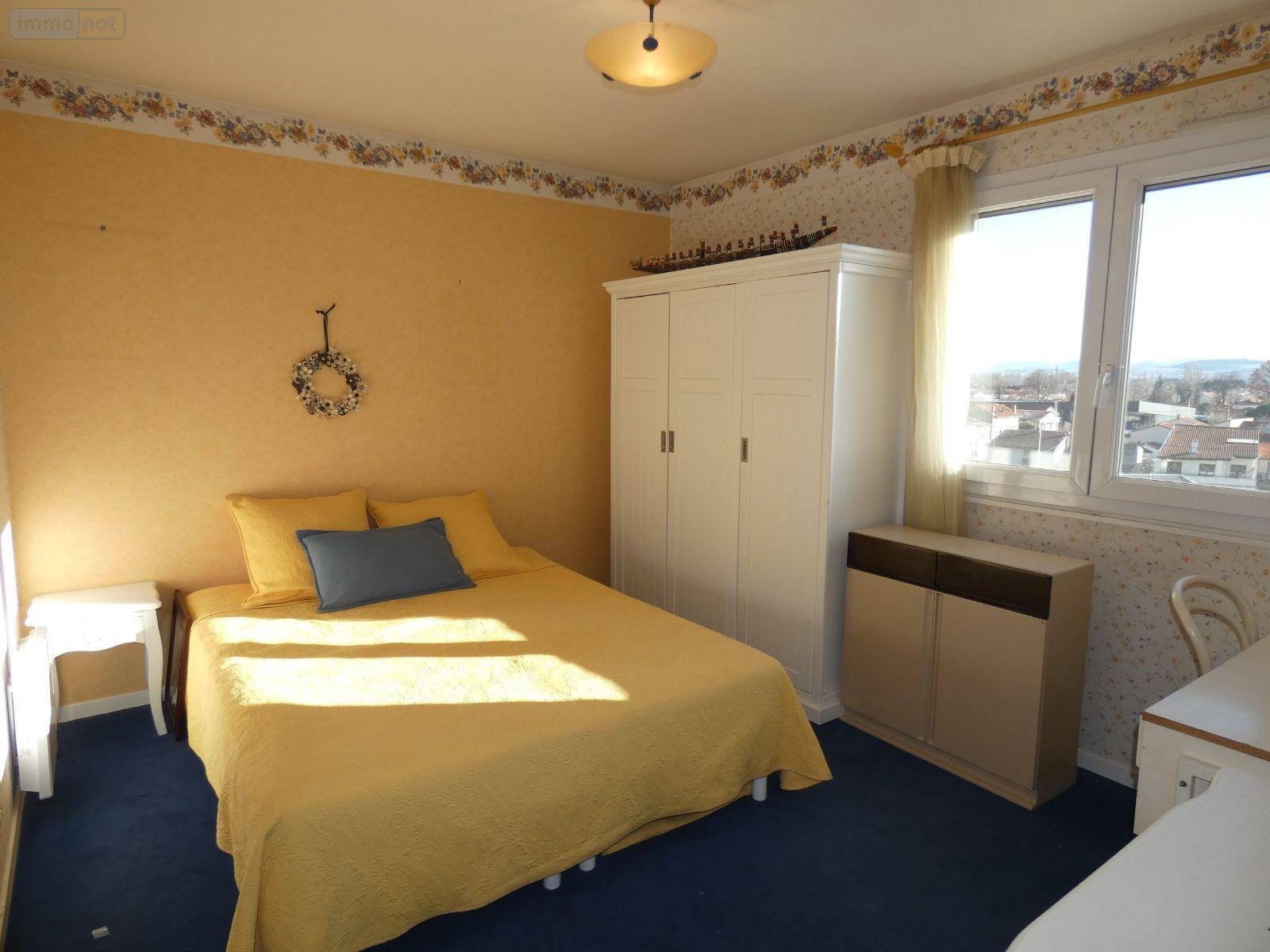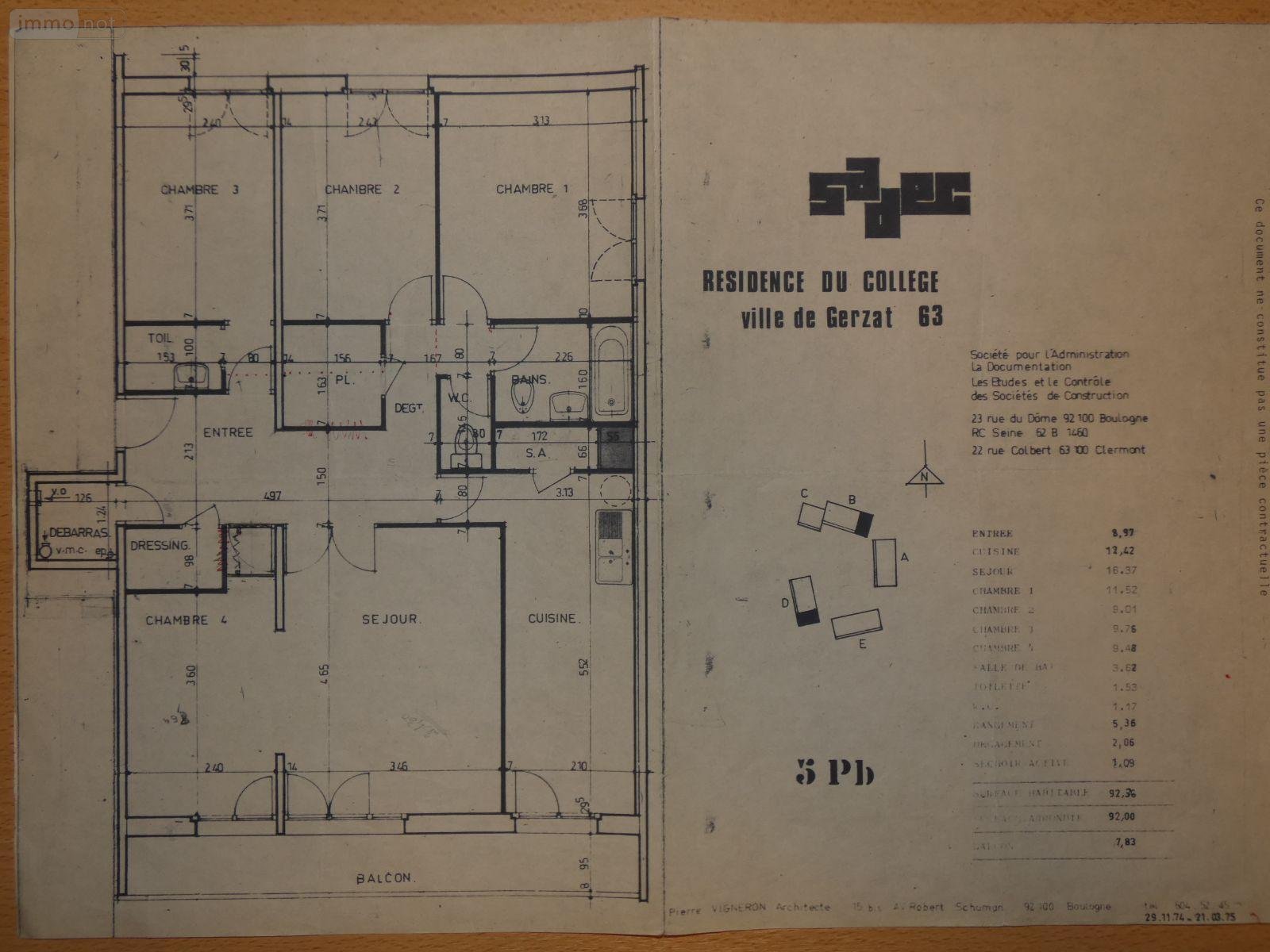 A vendre à GERZAT, à proximité de Clermont Ferrand en Auvergne, un appartement T4 bis au 5è et dernier étage avec ascenseur et avec très belle vue Ouest et Sud. Ce bel appartement comprend un grand hall d'entrée, deux placards, une chambre avec cabinet de toilettes,(11.51m²), deux chambres, (11.10 et 9.71m²), une salle d'eau, WC séparé, salon, salle à manger, cuisine avec cellier. Les pièces de vie donnent sur un grand balcon de près de 8m². Les dépendances sont constituées d'un garage fermé (16.5m²) et d'une cave. DPE : D Ascenseur. Les ++ : Une simple cloison brique sépare la cuisine et le séjour, Appartement très bien entretenu. Prix de vente 147 000 EUR dont Honoraires de Négociation charge acquéreur 5 % du prix net. Renseignements, visites, Office Notarial de GERZAT 047.73.25.80.40 et/ou 07.69.47.35.08