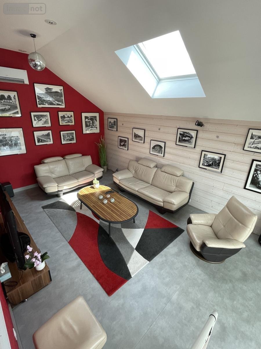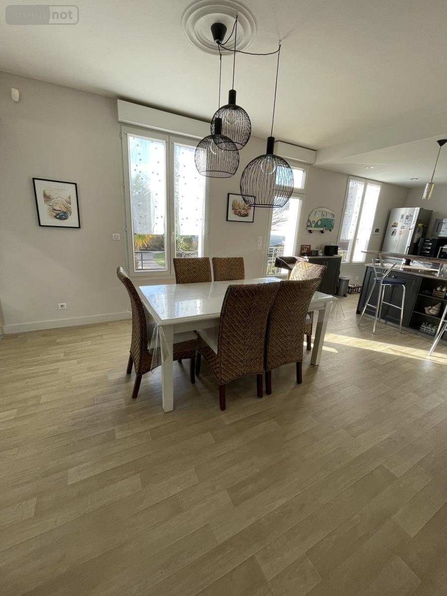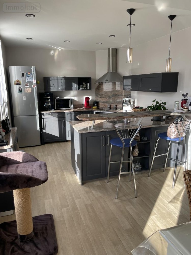 au rez-de-chaussée : entrée directe dans salon avec poêle bois, placard, cuisine aménagée équipée ouverte sur séjour,
