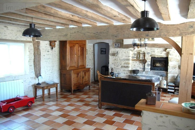 Une cuisine aménagée et équipée ouverte sur l'espace salon-séjour avec cheminée insert, arrière-cuisine, deux chambres, dégagement, salle d'eau, WC.