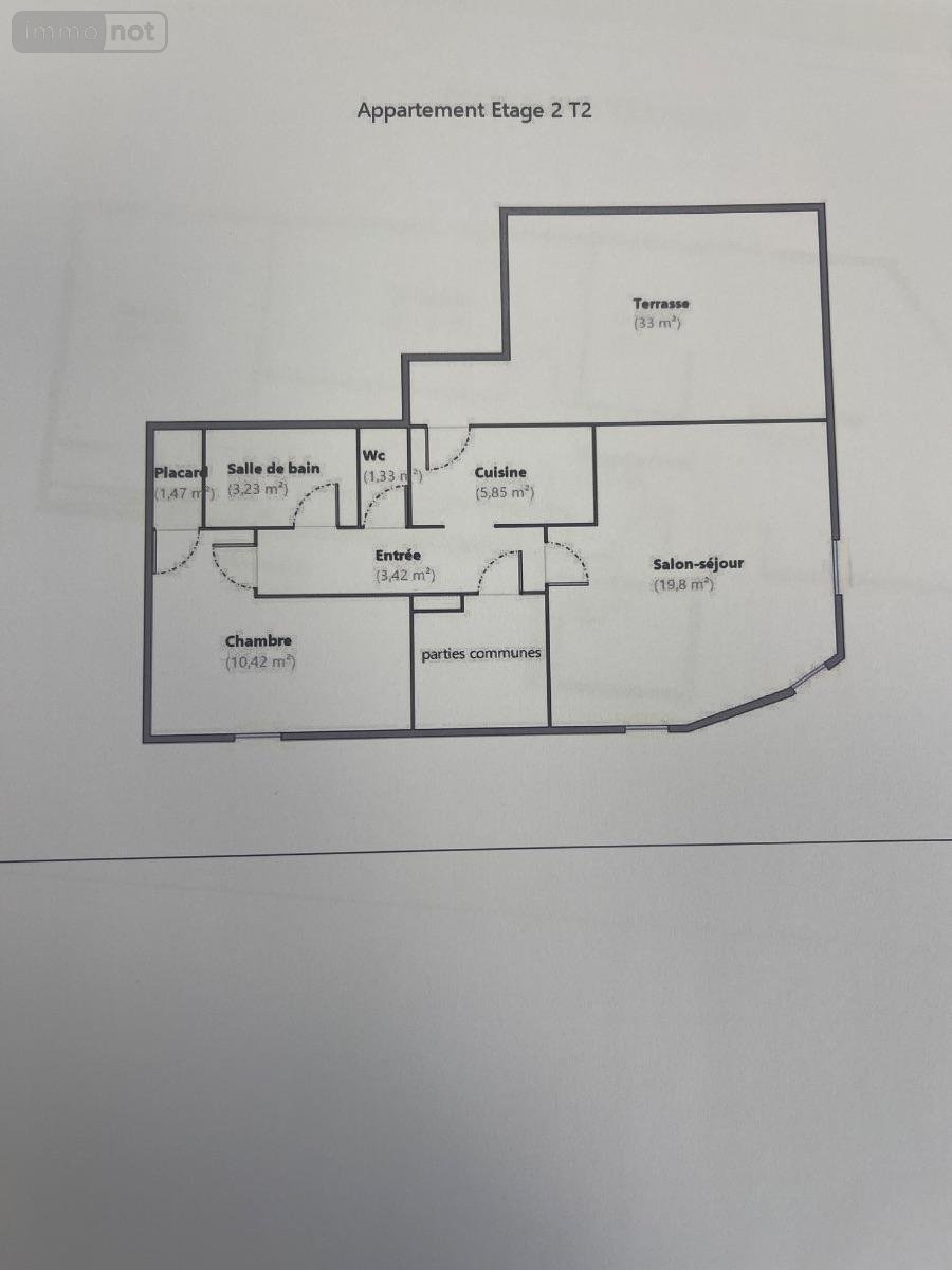 Séjour (14,50m²), Cuisine aménagée (6m²), dégagement (2,05m²), Salle d'eau et WC (3,42m²), couloir (4,33m²), chambre (11,79m²), chambre (9,92m²), placard (0,41m²)