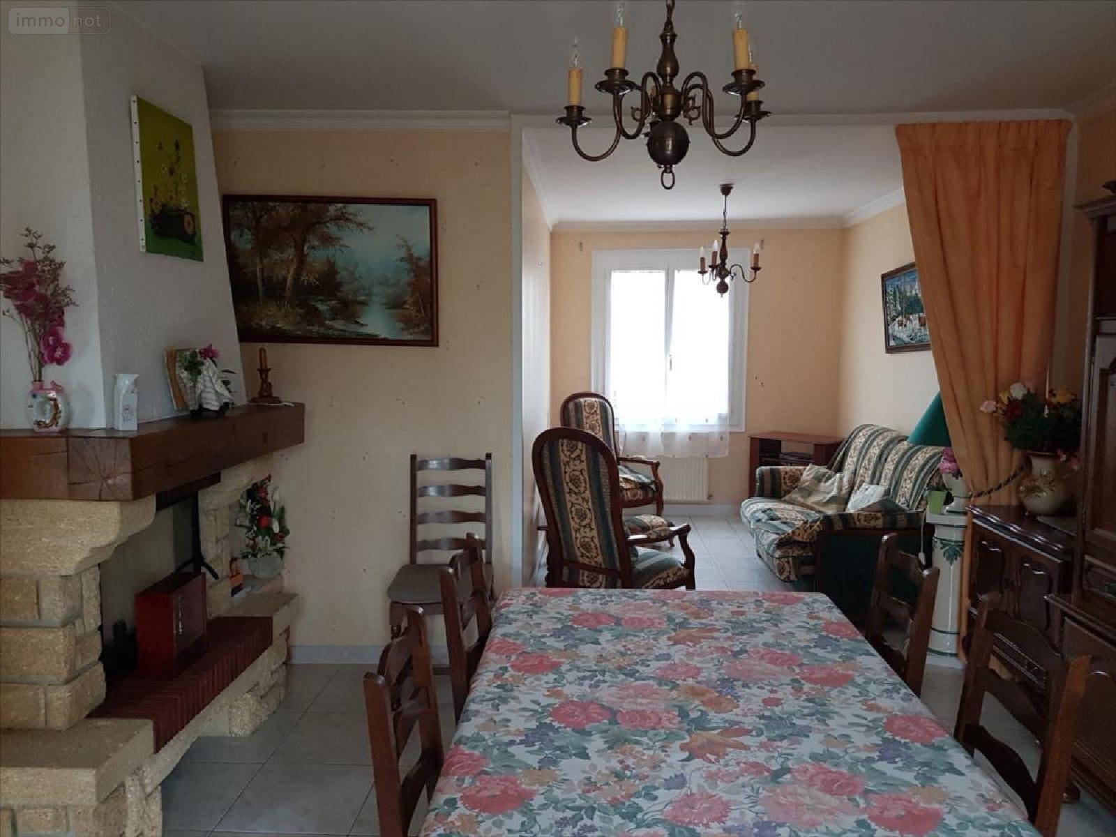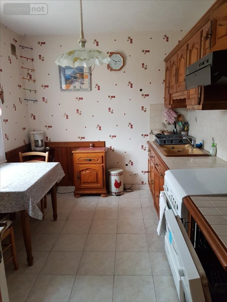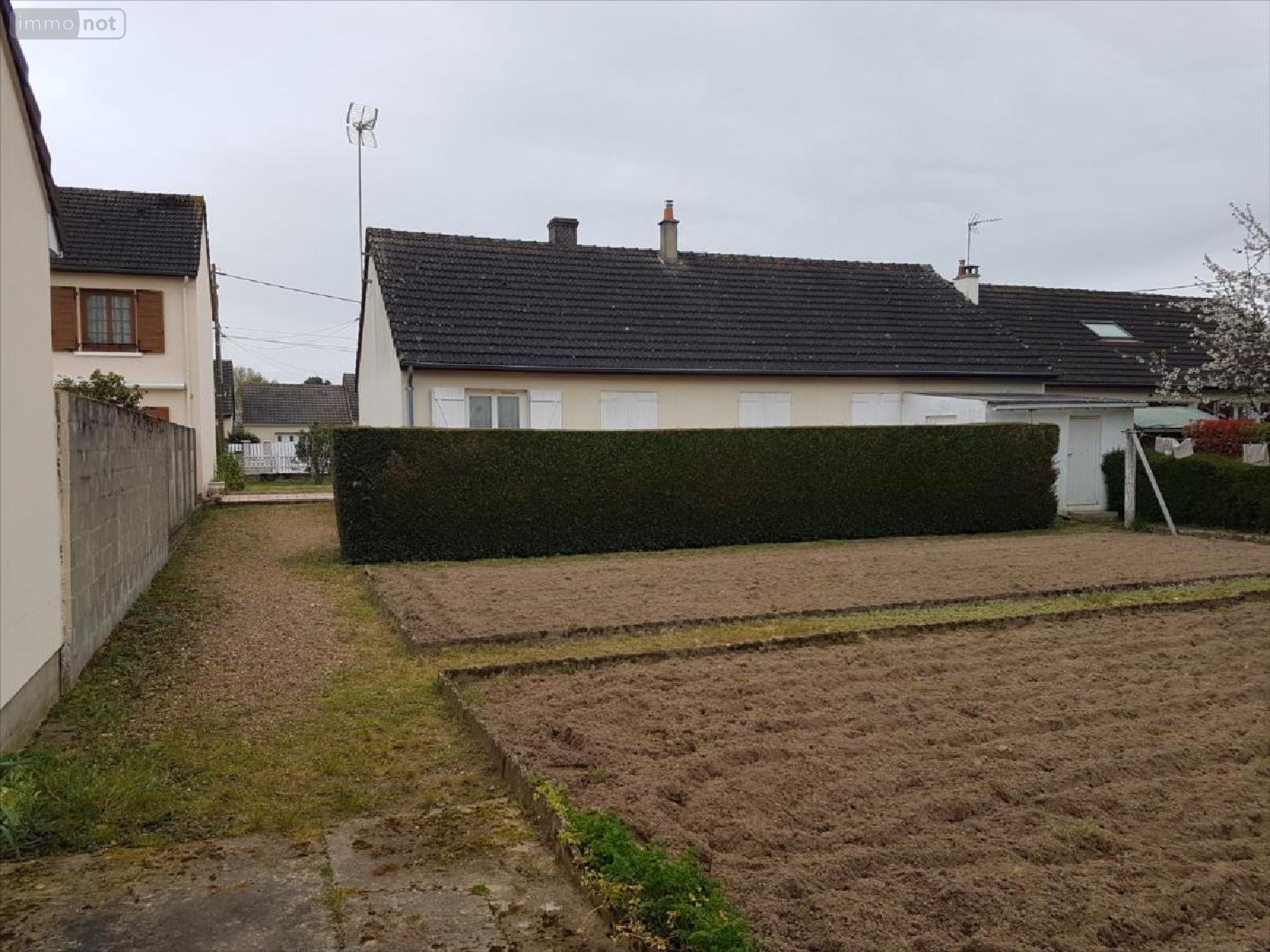 Pavillon plain-pied sur 751 m² : Entrée, cuisine aménagée, séjour (32 m²) traversant avec cheminée-insert, 3 chambres, salle d'eau, wc, débarras.Garage attenant avec lingerie. Abri de jardinJardin devant et derrière la maison.