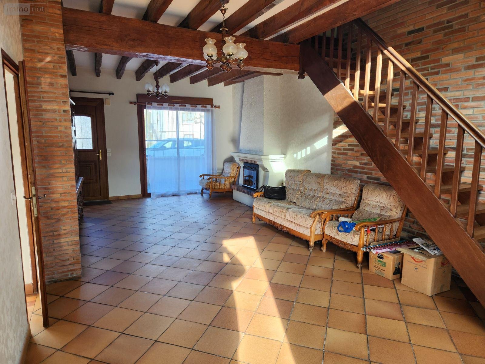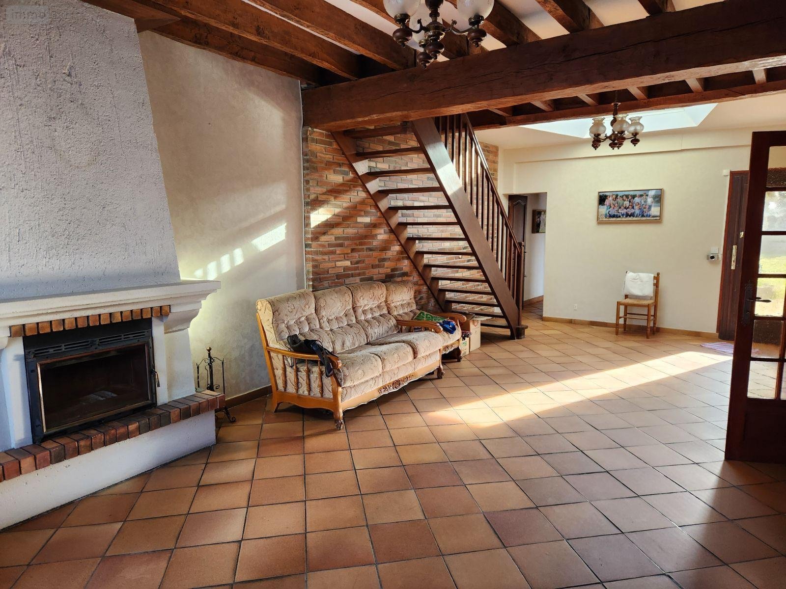 -RDC : Séjour avec cheminée-insert, cuisine aménagée, couloir, salle de bains, wc, chambre