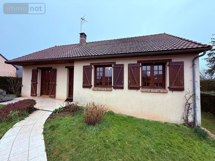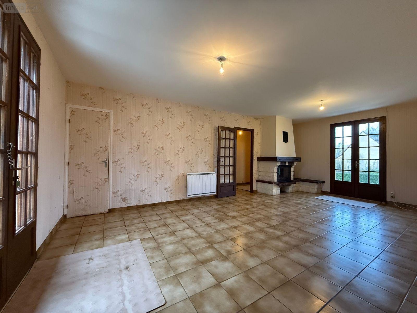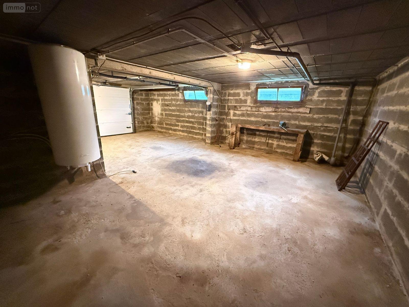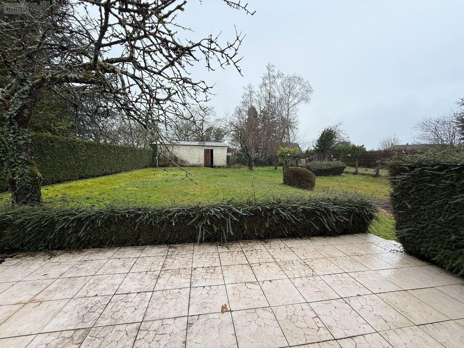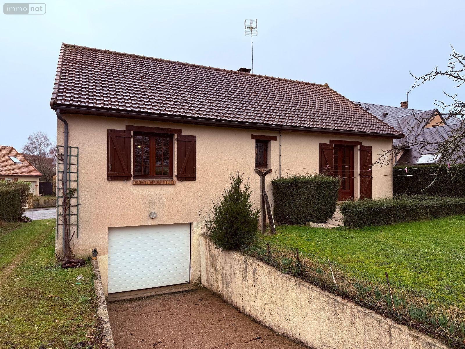CONLIE - Maison sur sous-sol comprenant : entrée avec placard, salon-séjour avec cheminée et accès terrasse, cuisine, WC, salle d'eau, rangement et deux chambres. Au sous sol : garage avec porte sectionnelle motorisée, cave et atelier. Jardin et abri. Chauffage électrique.