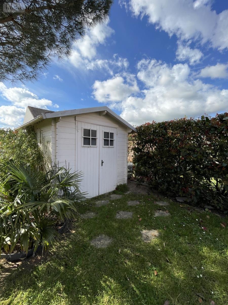 Terrain arboré et paysagé avec un petit chalet de jardin.