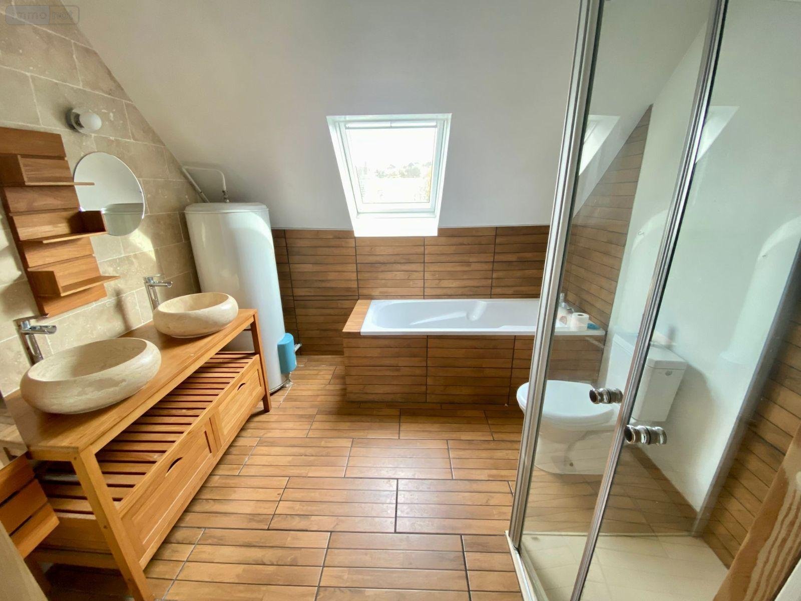 A l'étage, un palier distribue deux chambres, et une salle de bains avec douche et baignoire.