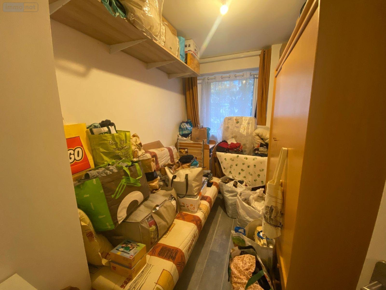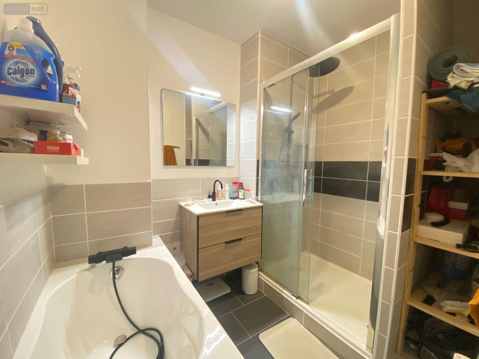 Entrée avec placard, séjour avec baies vitrées ouvert sur une cuisine aménagée, salle de bains avec douche et baignoire, deux chambres, dégagement avec rangements.