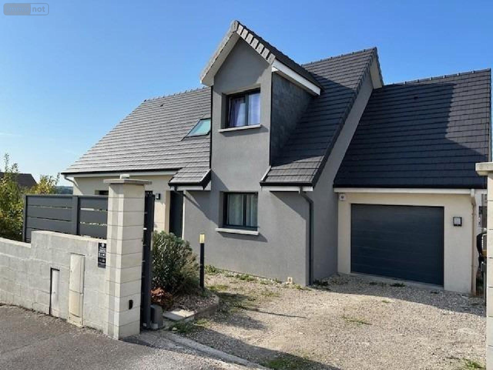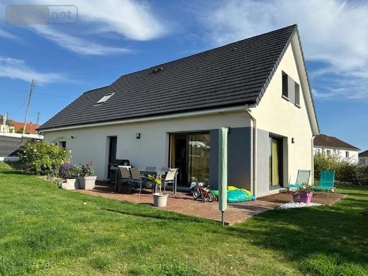 Maison à vendre à Neufchâtel-en-Bray en Seine-Maritime (76), construction récente, comprenant : entrée avec placard, W.C. avec lave mains, cuisine aménagée ouverte sur le séjour/salon, chambre avec salle de douche, cellier. A l'étage : palier à usage de bureau, trois chambres, W.C., salle de bains. Garage attenant avec grenier. Chauffage au gaz de ville par plancher chauffant au rez-de-chaussée et radiateurs à l'étage. Double vitrage alu. Chauffe-eau thermodynamique, Adoucisseur d'eau. Tout-à-l'égout. Terrasse en bois. Jardin. Le tout sur un terrain de 617 m²