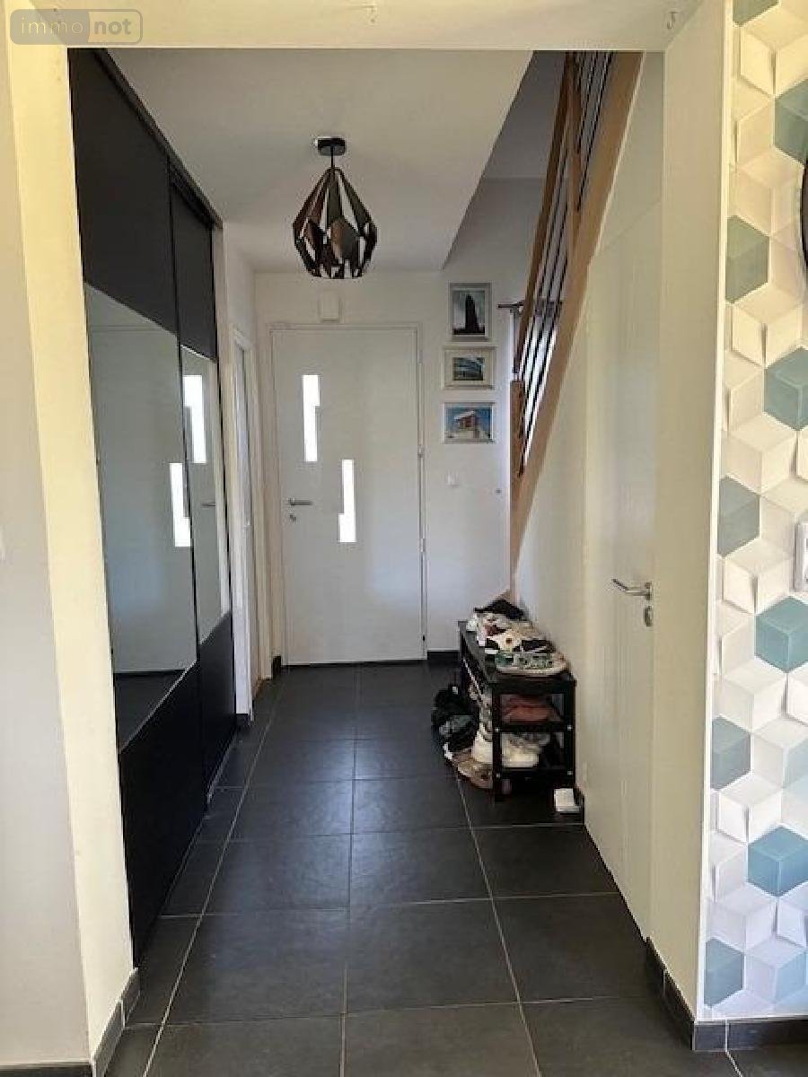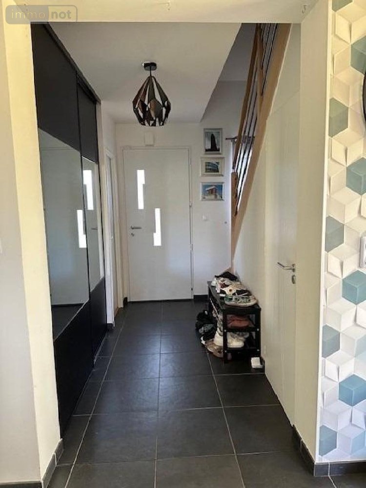 Maison comprenant : entrée, W.C. avec lave mains, cuisine aménagée ouverte sur le séjour/salon, chambre avec salle de douche, cellier. A l'étage : palier à usage de bureau, trois chambres, W.C., salle de bains. Garage attenant avec grenier. Chauffage au gaz de ville. Double vitrage alu. Chauffe-eau thermodynamique, Adoucisseur d'eau. Tout-à-l'égout. Terrasse en bois. Jardin. Le tout sur un terrain de 617 m²