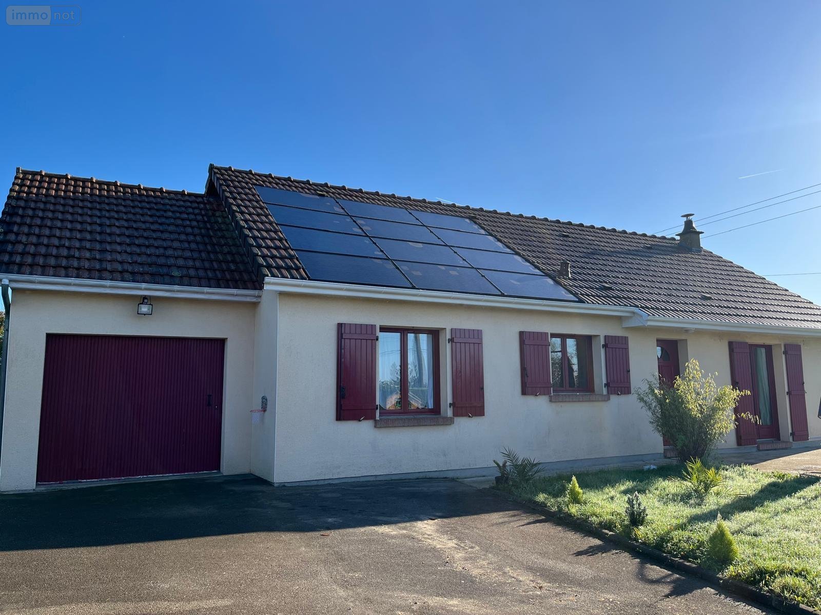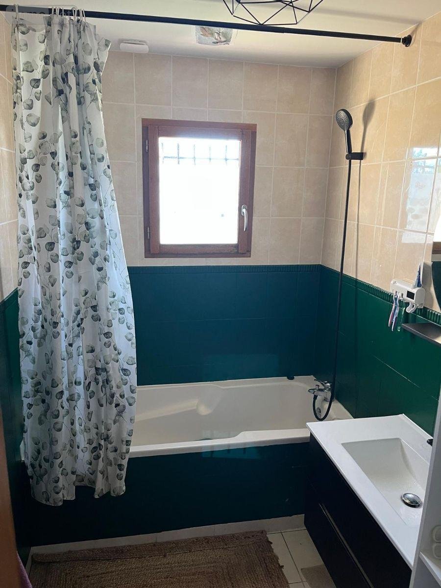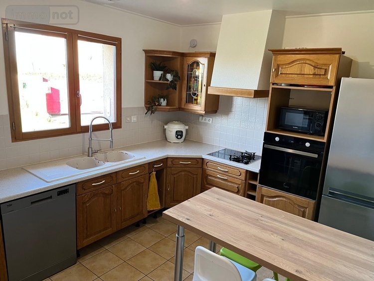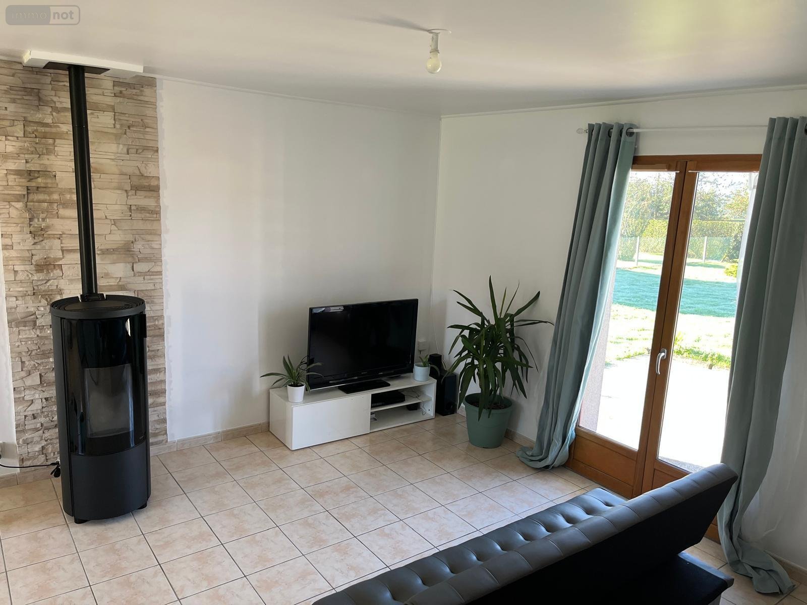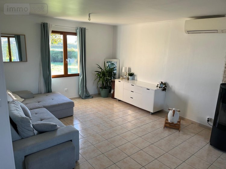 entrée semi-ouvert sur séjour / salon avec poële à granulés, cuisine aménagée, 3 chambres, salle de bains, wc,