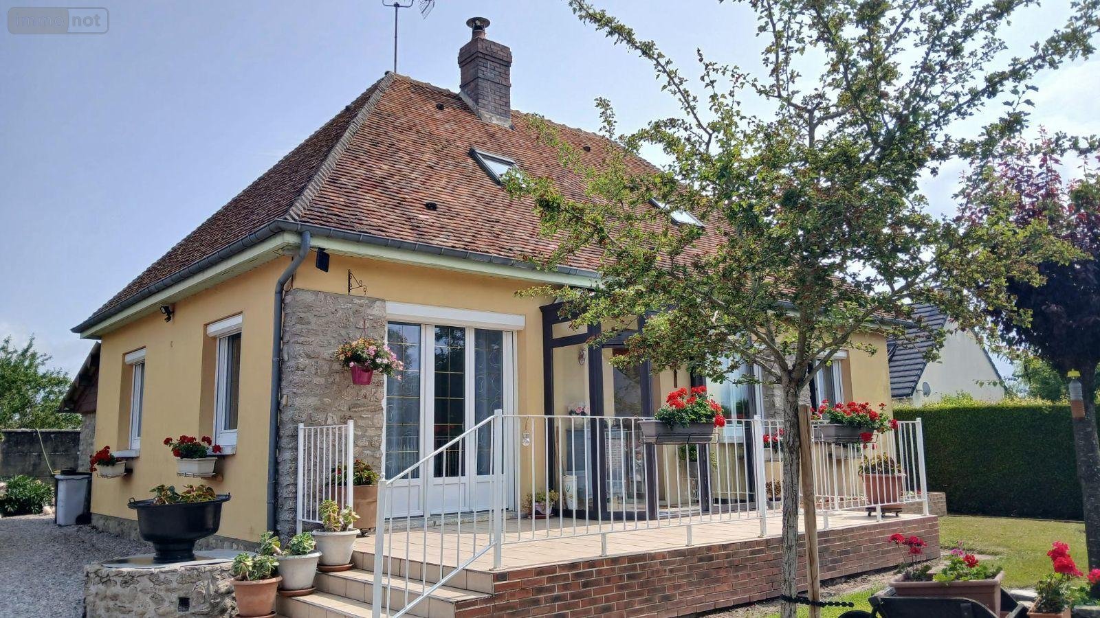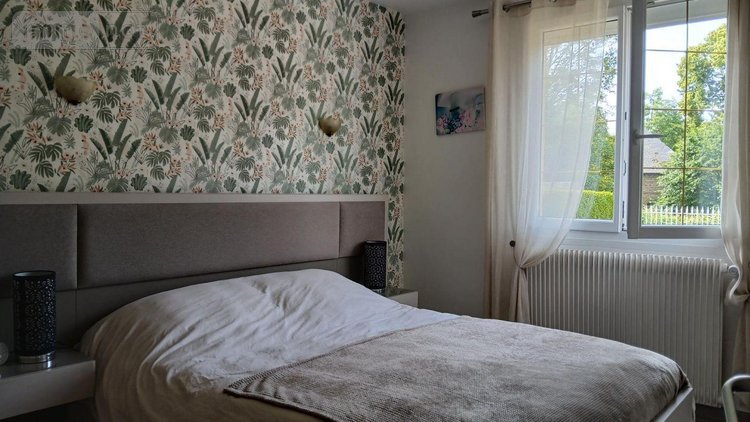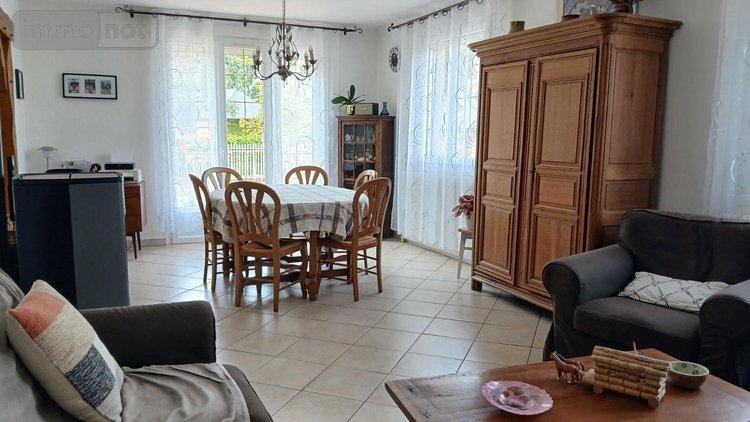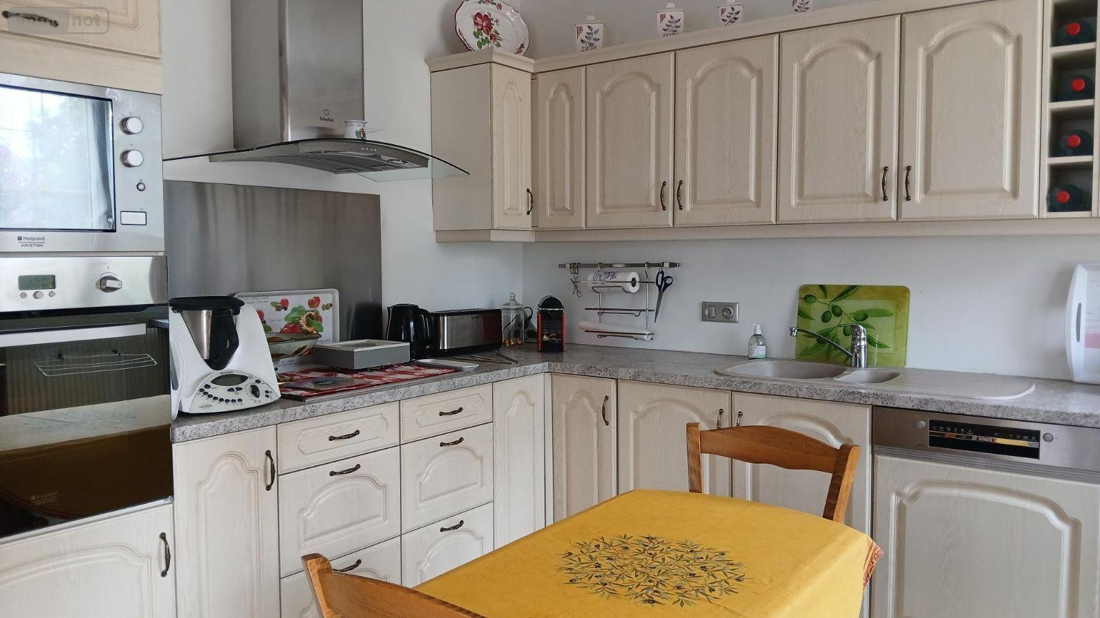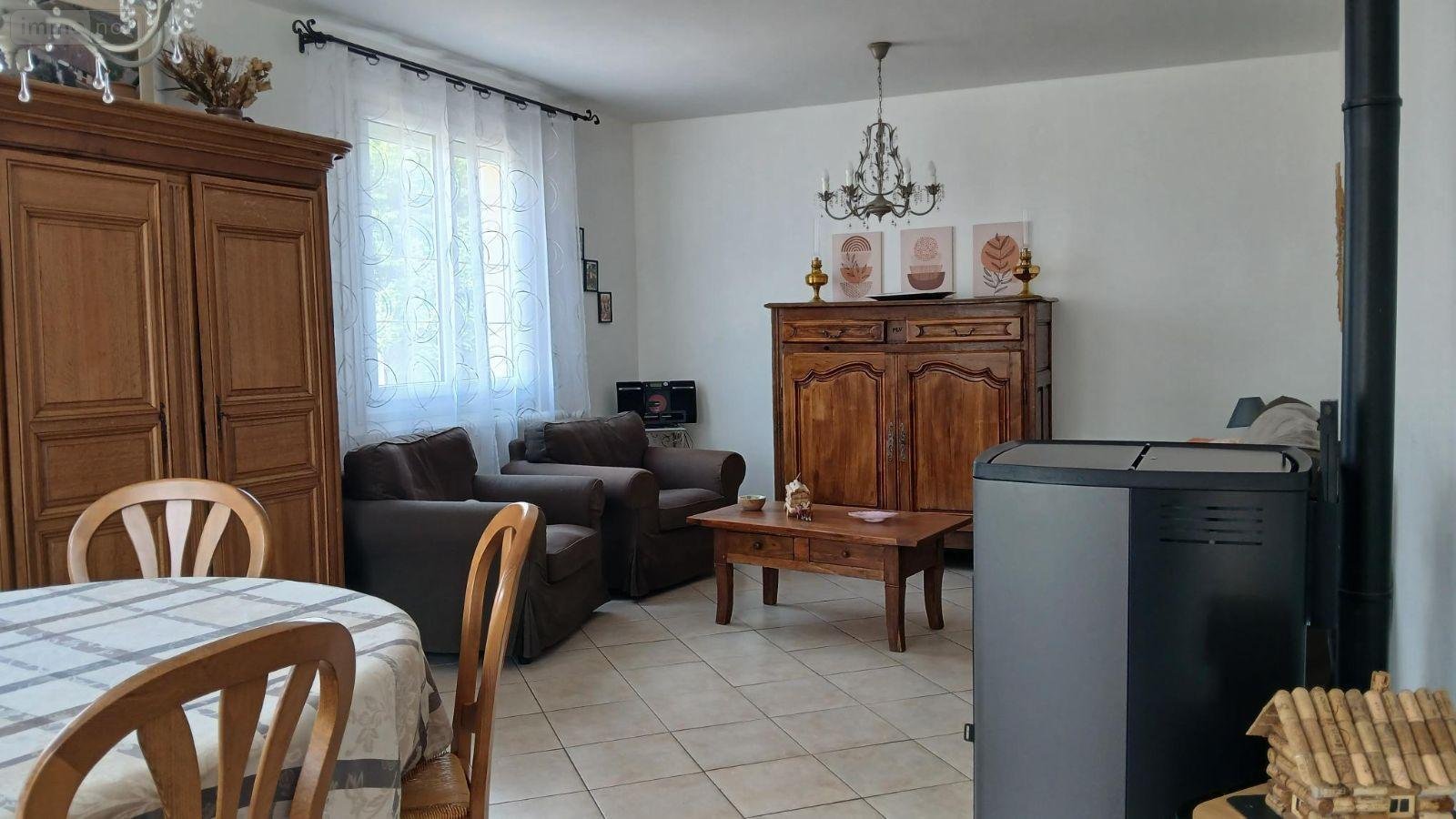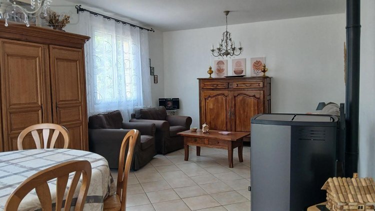 entrée, séjour / salon avec poële à granulés, cuisine aménagée et équipée, 2 chambres, salle d'eau, wc,