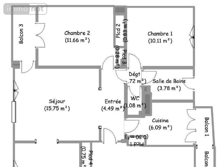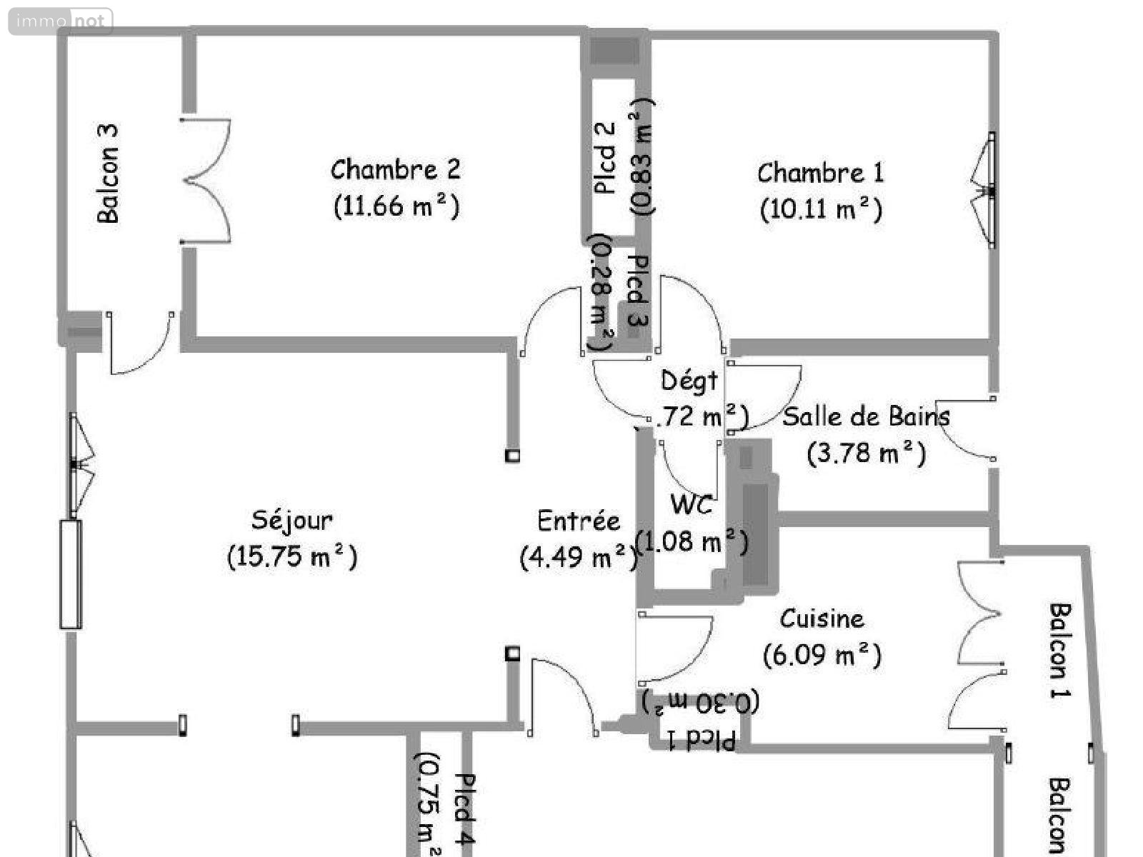 Il comprend une entrée de 4.49m², cuisine de 6.09m² avec accès au balcon, salon-salle à manger de 25.33m² avec placard et accès au balcon, 2 chambres de 10.11m² et 11.66m² dont une donnant sur un balcon, salle de bains de 3.76m², WC séparés.