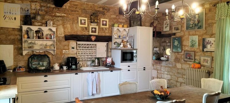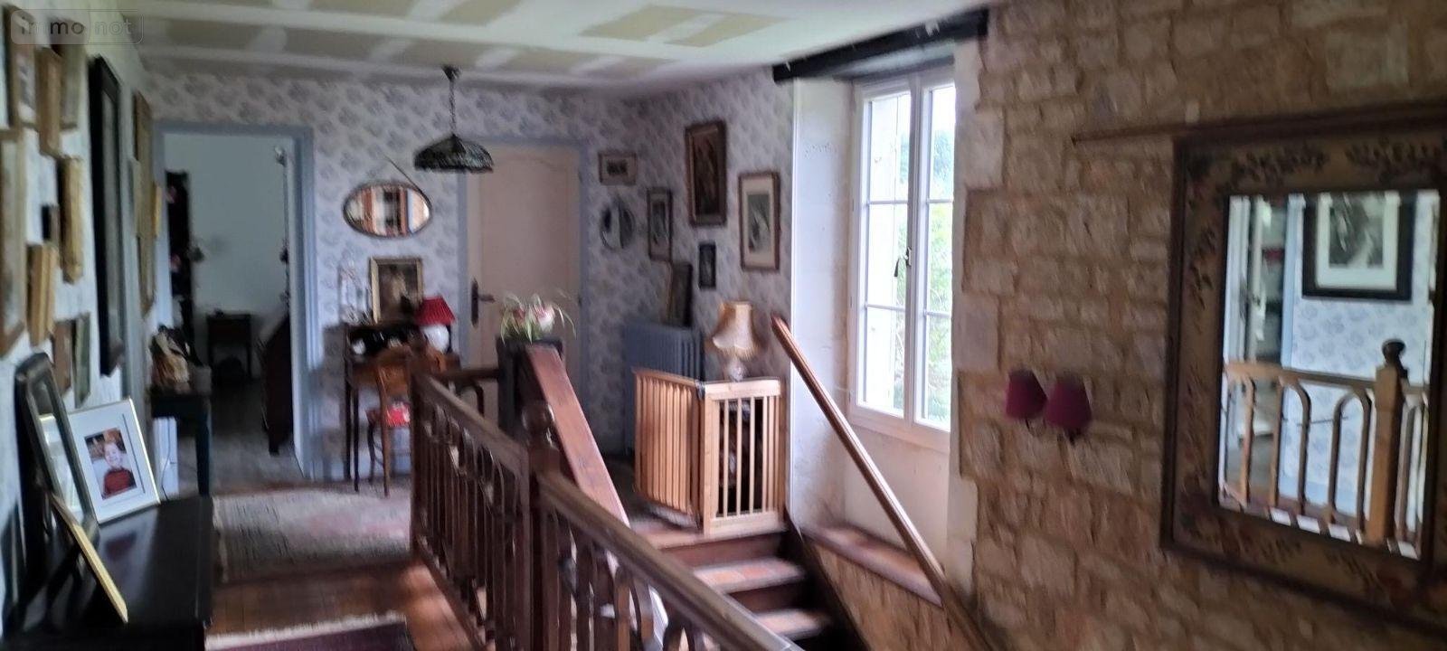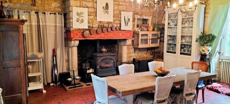 COUP DE COEUR A 5 MIN DE MELLE! Nichée dans un écrin de verdure sans vis à vis, propriété de caractère atypique et dépendances offrant 132m² hab. Cuisine-salle à manger 35m² avec poêle, séjour 37m² avec poêle, wc. A l'étage: vaste palier avec coin bureau desservant 3 chambres et salle de bains avec wc, débarras. Au second étage, grenier aménageable de 72m².