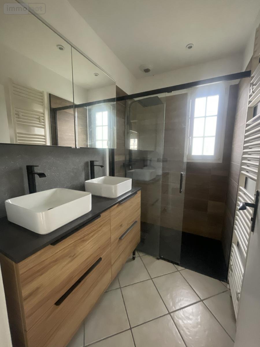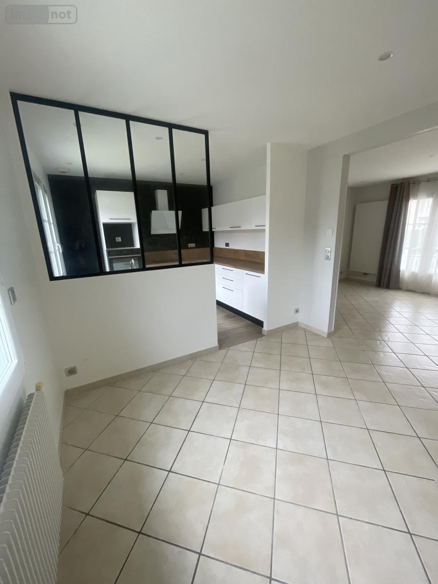 Entrée avec placards de rangement, séjour et salle à manger, cuisine aménagée et équipée (hotte, four, plaque), douche à l'italienne, deux chambres dont une avec placards de rangement, WC séparé