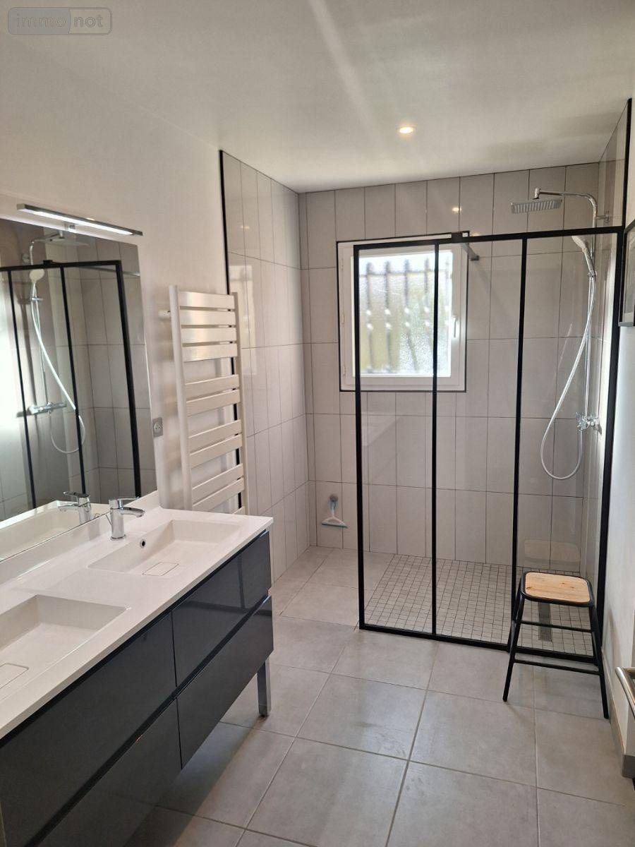 Maison plain-pied de 2001 sur sous-sol complet, composée d'une entrée, d'un salon, d'une salle à manger, d'une cuisine équipée / aménagée, d'une salle de douches, d'un wc et de trois chambres.