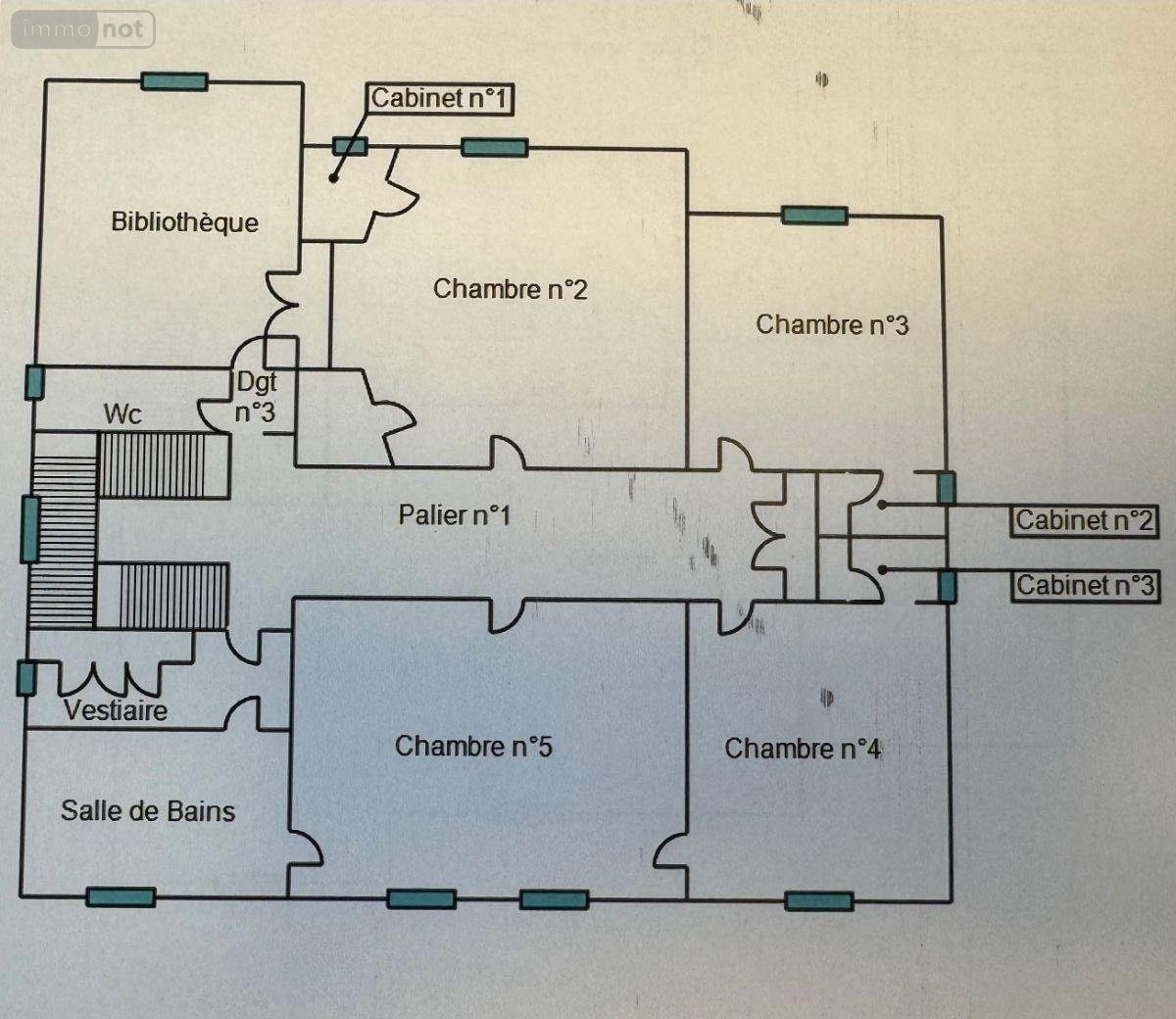 1er étage : palier desservant 4 chambres spacieuses (plus de 15m2) dont certaines avec point d'eau, parquet, anciennes cheminées, salle de bains avec charmant petit balcon, WC, lingerie,