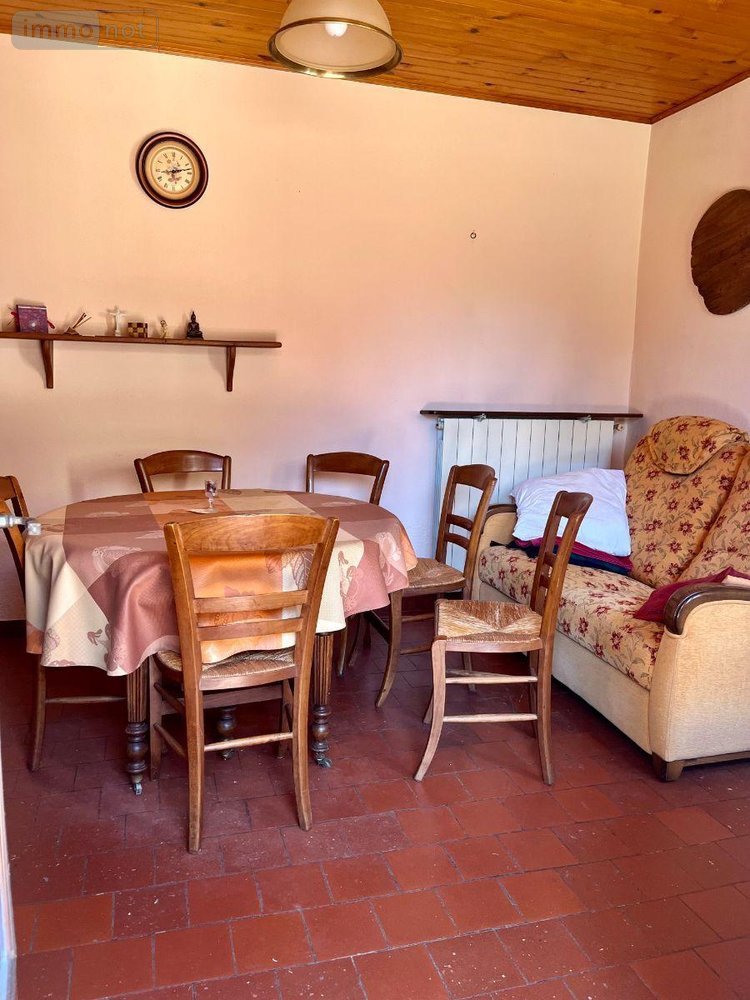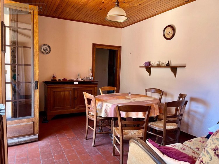 Entrée dans une salle à manger, une cuisine, un WC et une salle d'eau, un couloir desservant un séjour avec une cheminée, deux chambres.