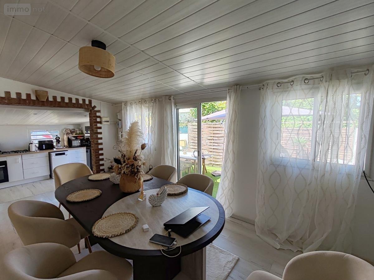 Cuisine ouverte, cuisine d'extérieur, séjour avec cheminée, salle d'eau et de bain, WC indépendant, chambre à l'étage.