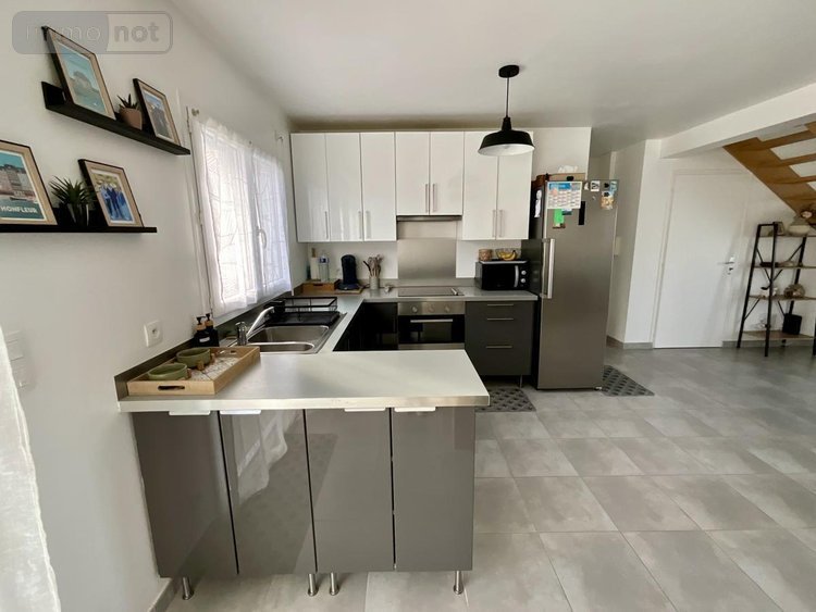 - Au rez-de-chaussée : salon-séjour, cuisine ouverte aménagée et équipée (plaque, four, hotte), chambre, salle d'eau avec WC.