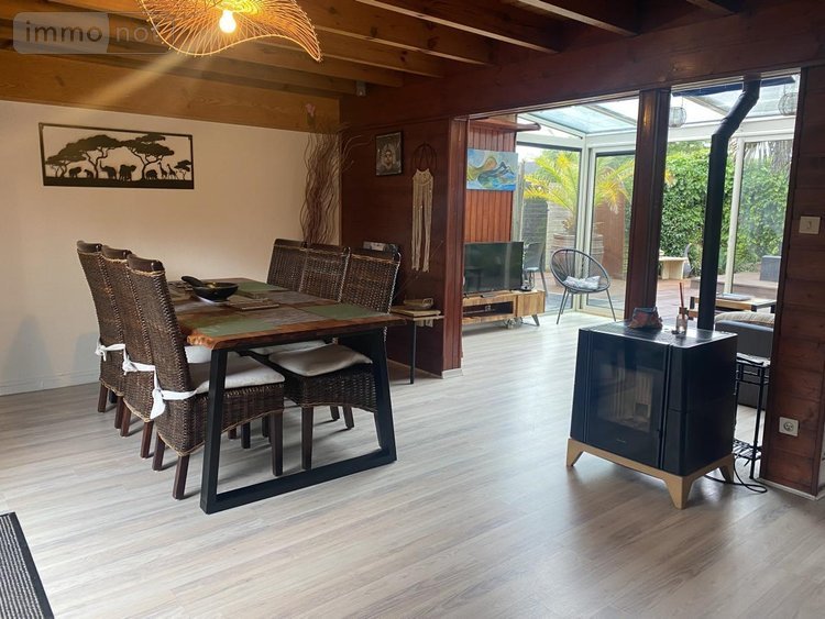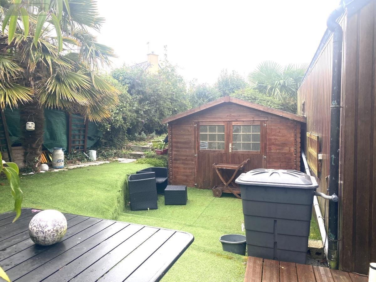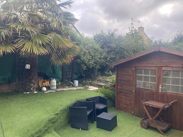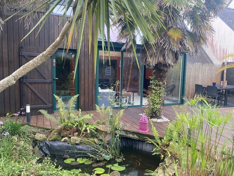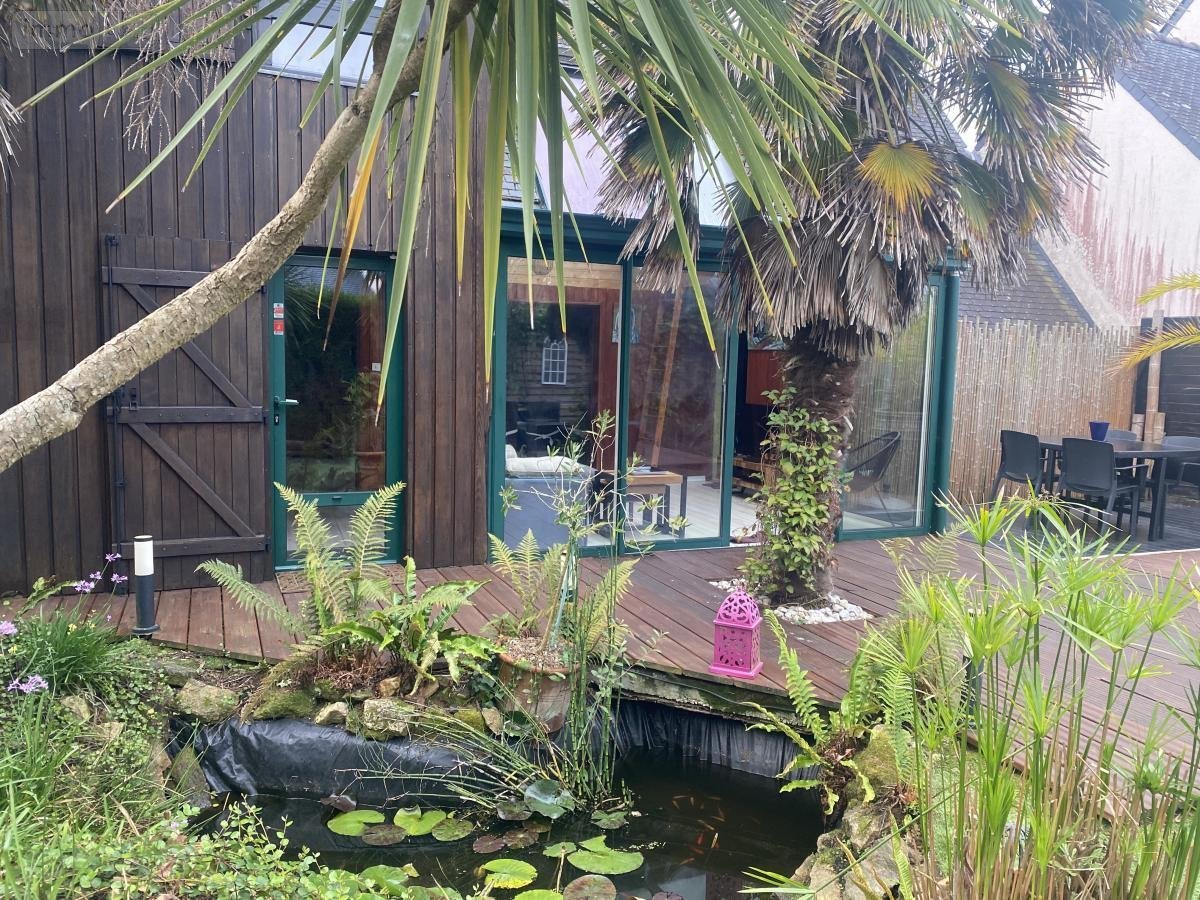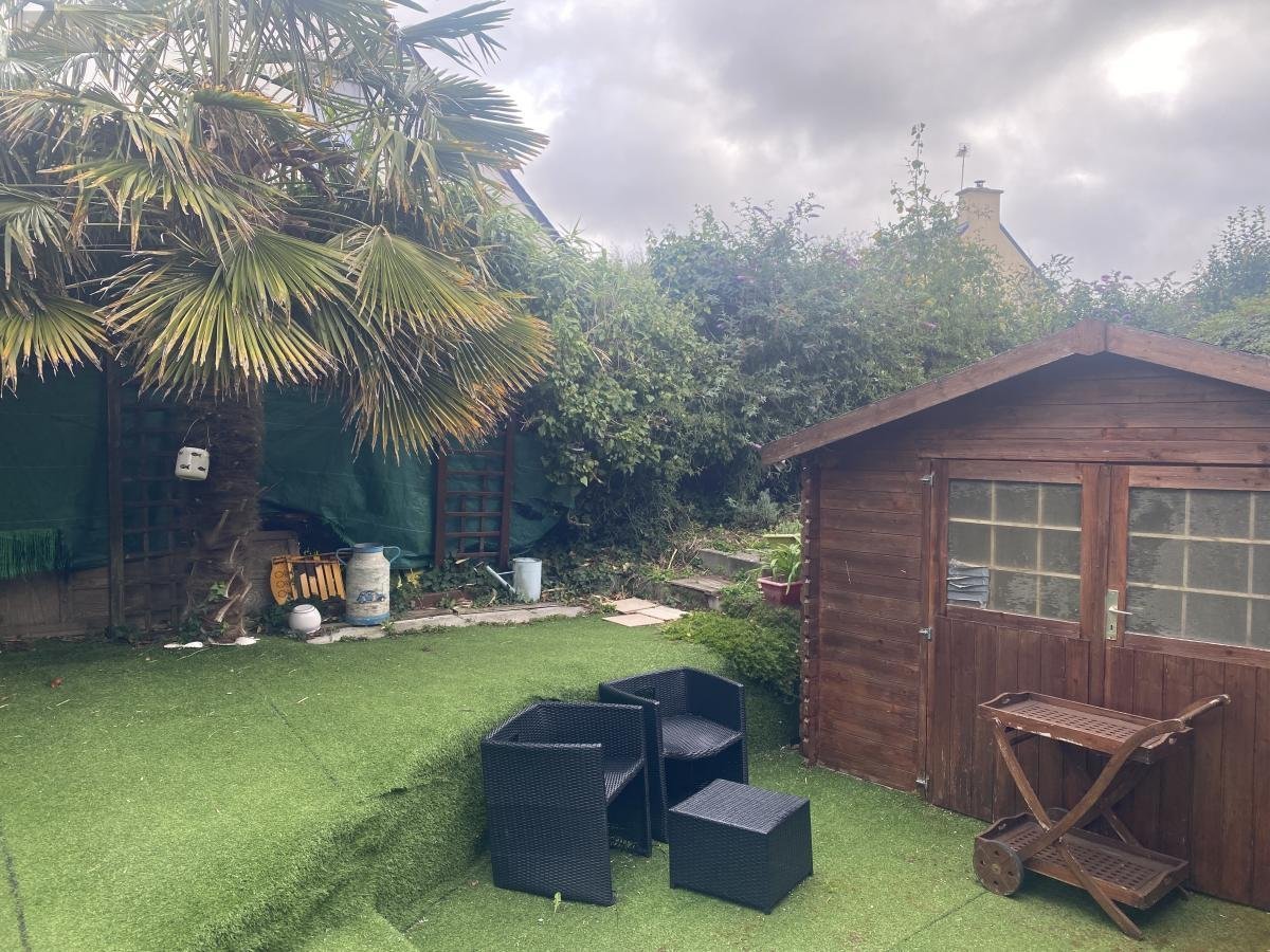 Proche de la plage de Guidel, maison très lumineuse dans un jardin arboré et paysagé offrant au rez de chaussée un séjour salon cuisine ouverte sur la terrasse , salle d eau, wc, une pièce attenante buanderie et garage vélo