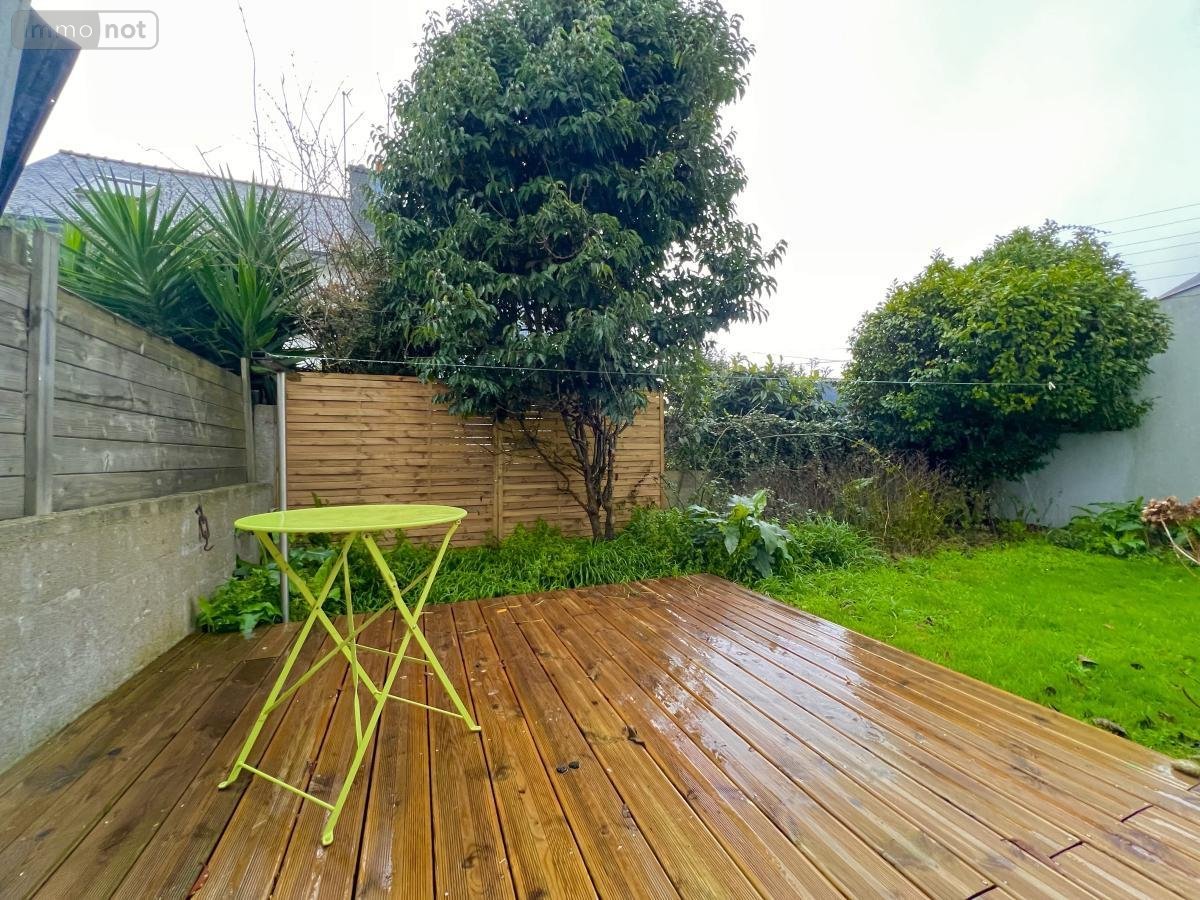 PLOEMEUR, les commodités à pied. Maison mitoyenne d'un coté, lumineuse et exposée SUD. Elle se compose d'une véranda à usage d'entrée, vaste salon séjour avec poele à granulés et cuisine aménagée avec coin repas et donnant sur une jolie terrasse à l'abri des regards, wc, à l'étage, 3 ch., SDD av. WC et un beau grenier au dessus. Grand garage. Terrain clos.